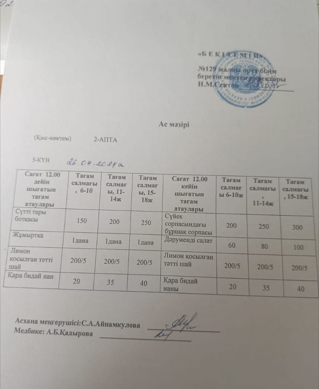 26.04.2024ж. Бір күндік асхана мәзірі » №129 жалпы орта білім беретін мектеп