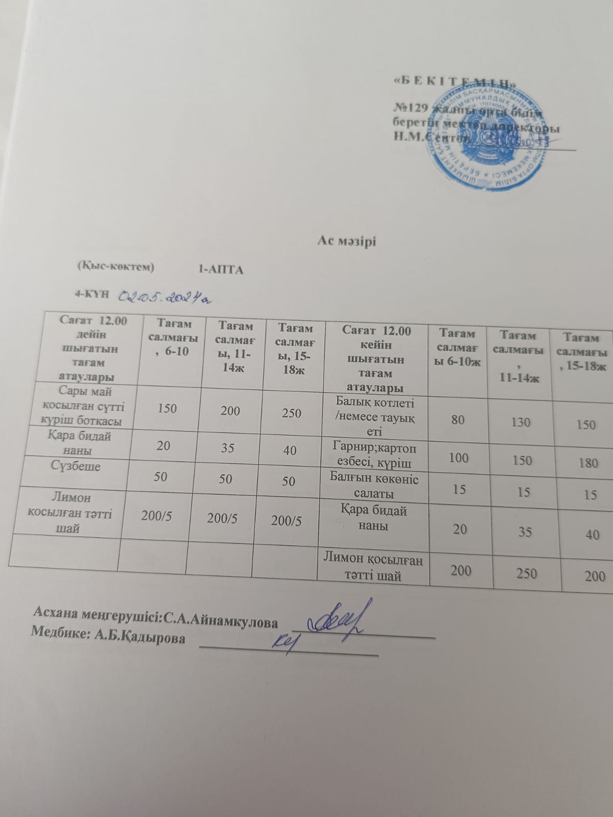 02.05.2024ж. Бір күндік асхана мәзірі » №129 жалпы орта білім беретін мектеп