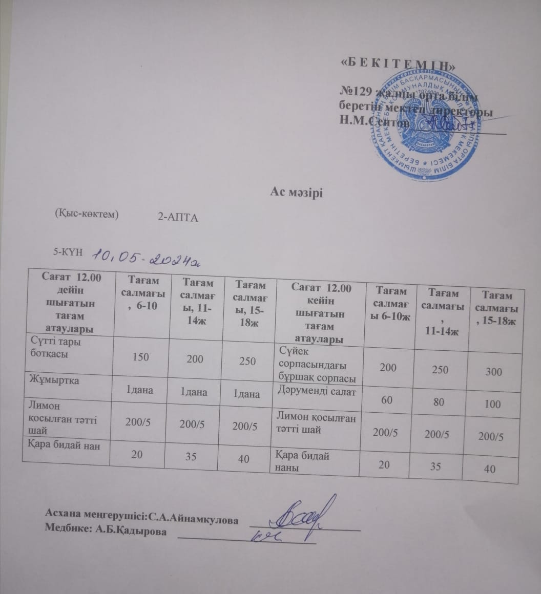 10.05.2024ж. Бір күндік асхана мәзірі » №129 жалпы орта білім беретін мектеп