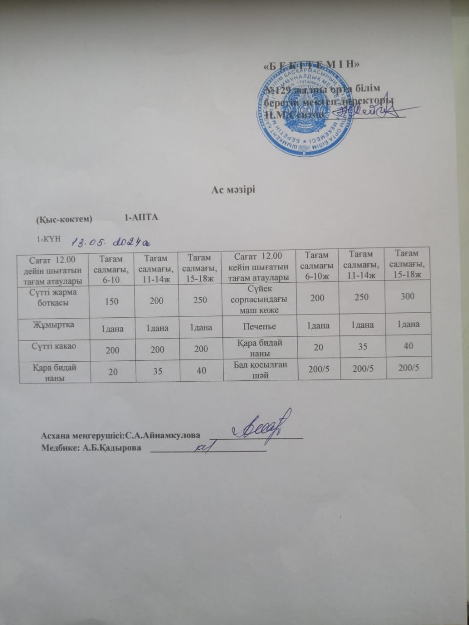 13.05.2024ж. Бір күндік асхана мәзірі » №129 жалпы орта білім беретін мектеп