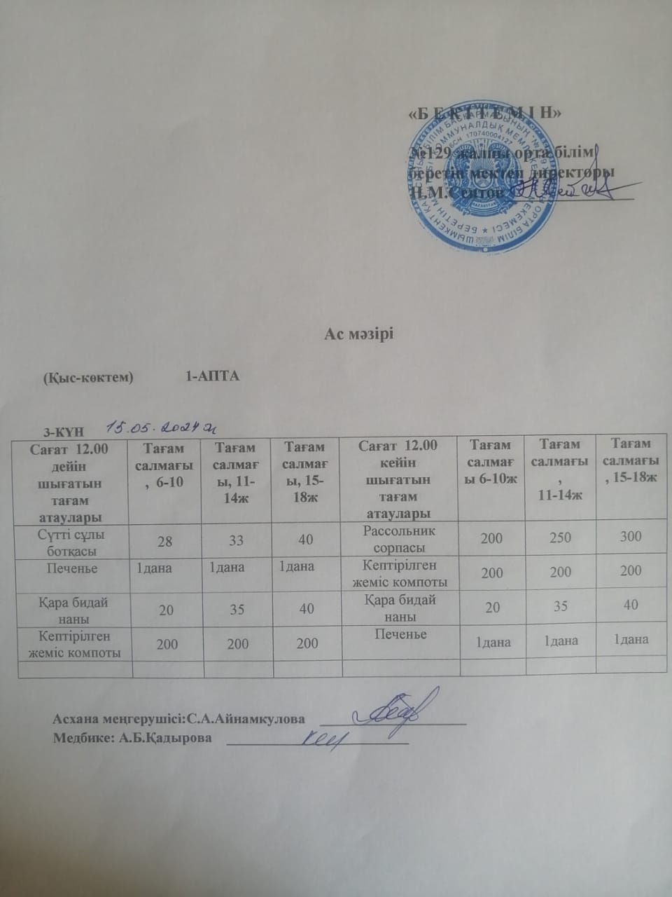 15.05.2024ж. Бір күндік асхана мәзірі » №129 жалпы орта білім беретін мектеп