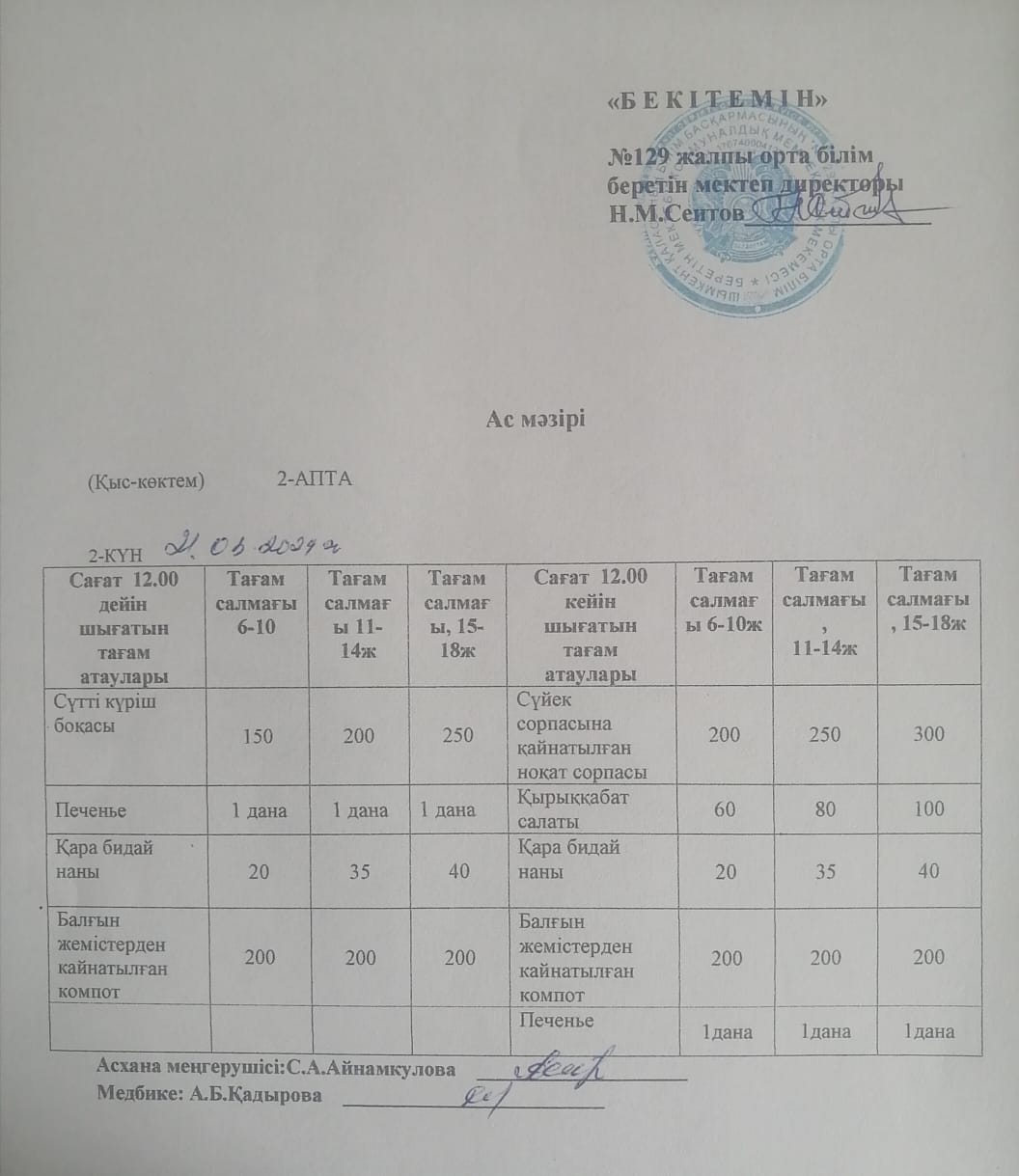 21.05.2024ж. Бір күндік асхана мәзірі » №129 жалпы орта білім беретін мектеп