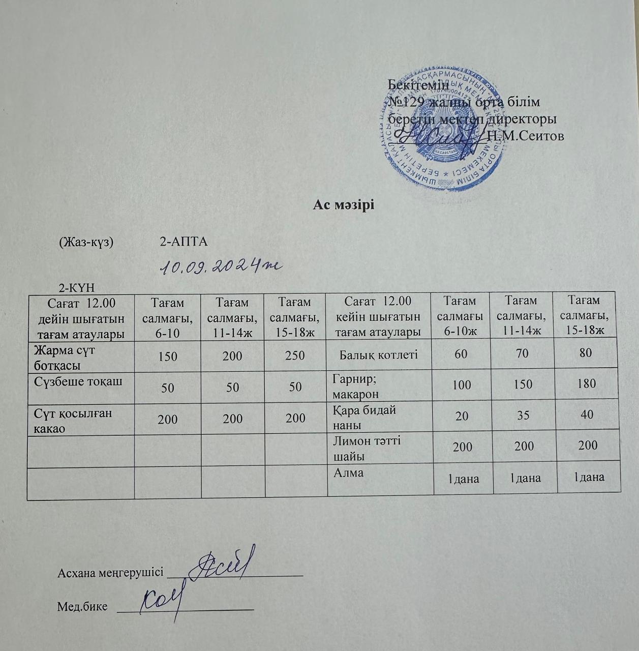 10.09.2024ж. Бір күндік асхана мәзірі » №129 жалпы орта білім беретін мектеп