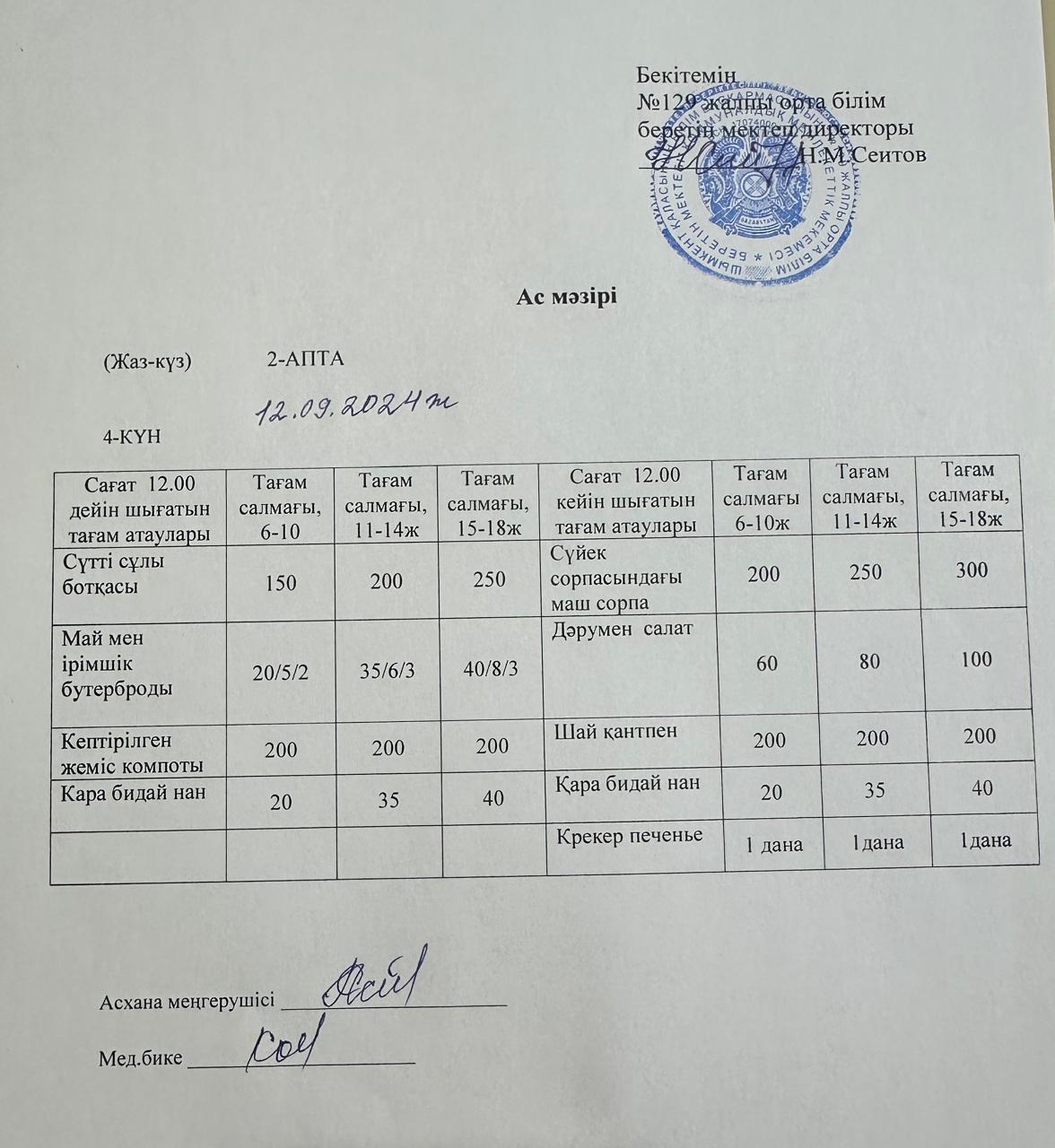 12.09.2024ж. Бір күндік асхана мәзірі » №129 жалпы орта білім беретін мектеп