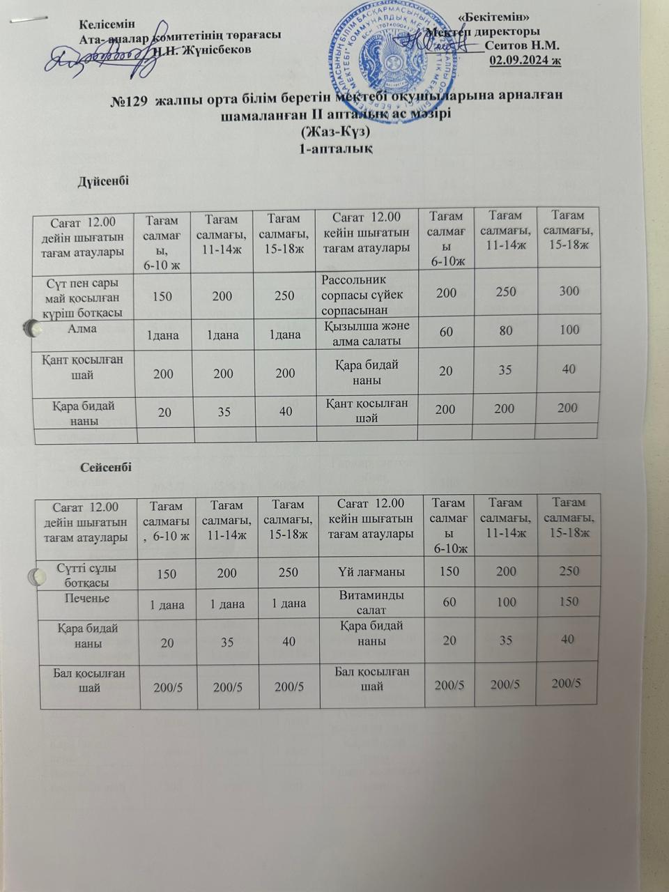 02.09.2024ж. Жаз-күз ІІ апталық ас мәзірі » №129 жалпы орта білім беретін мектеп