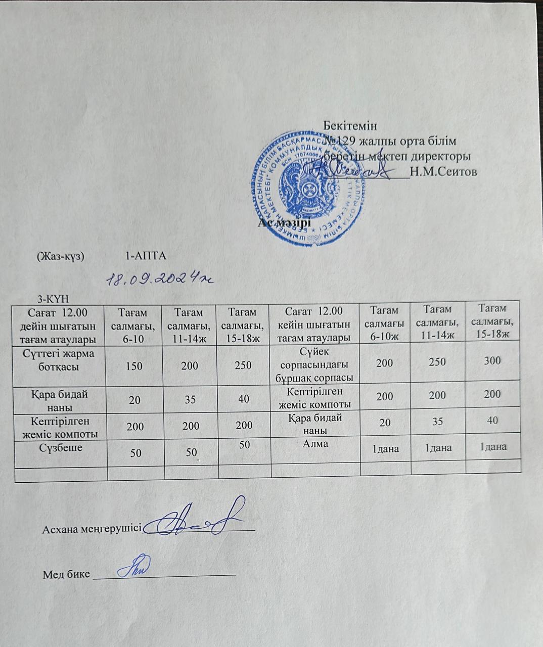 18.09.2024ж. Бір күндік асхана мәзірі » №129 жалпы орта білім беретін мектеп