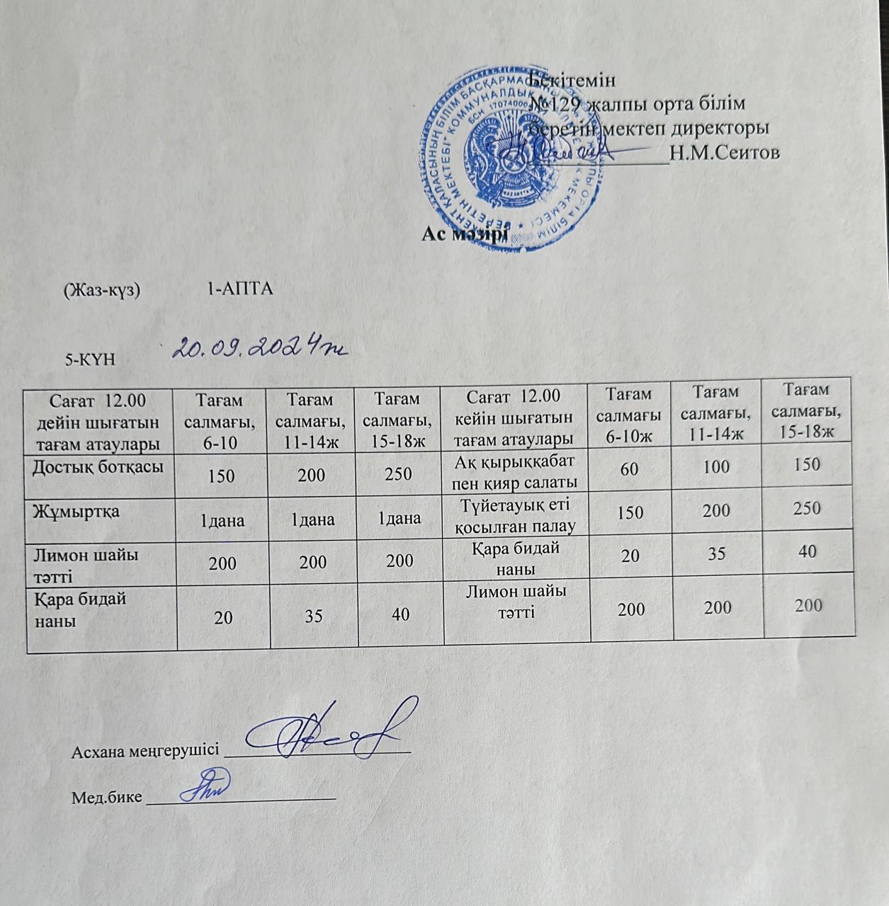 20.09.2024ж. Бір күндік асхана мәзірі » №129 жалпы орта білім беретін мектеп