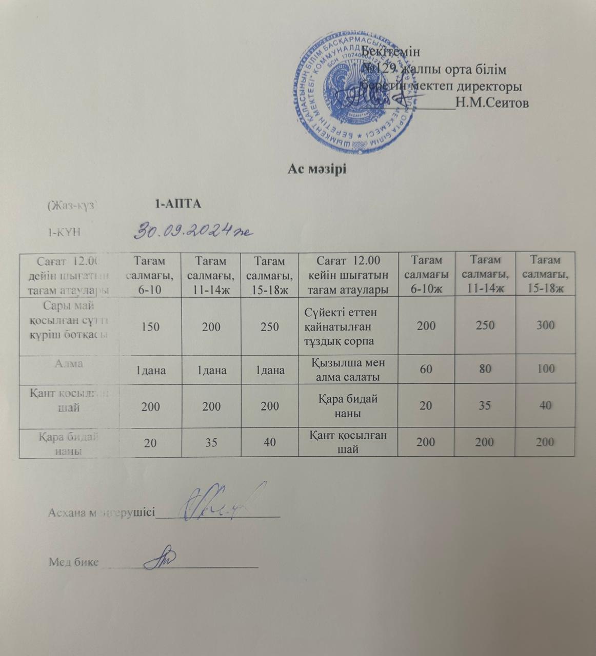 30.09.2024ж Бір күндік асхана мәзірі » №129 жалпы орта білім беретін мектеп