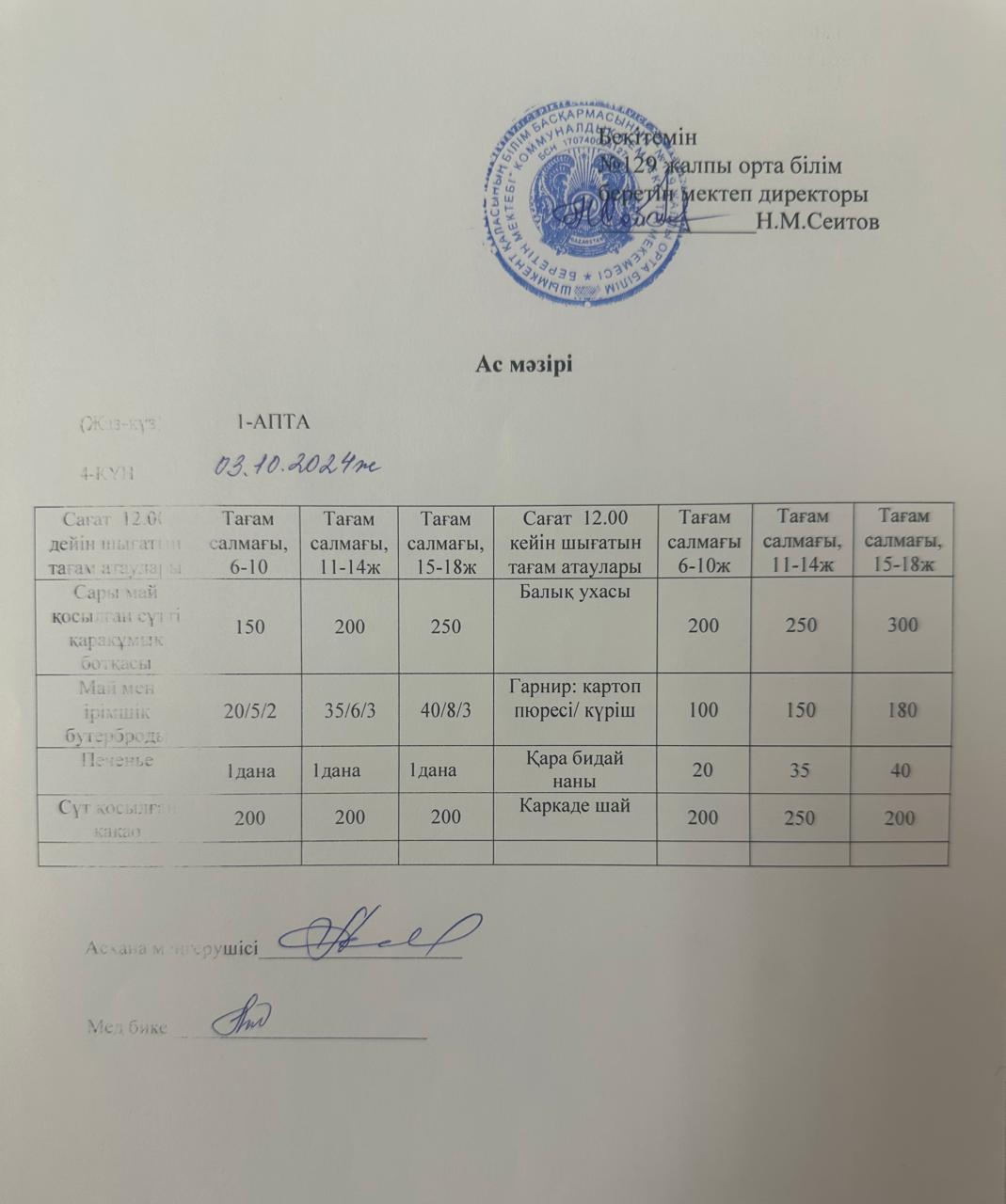 03.10.2024ж Бір күндік асхана мәзірі » №129 жалпы орта білім беретін мектеп
