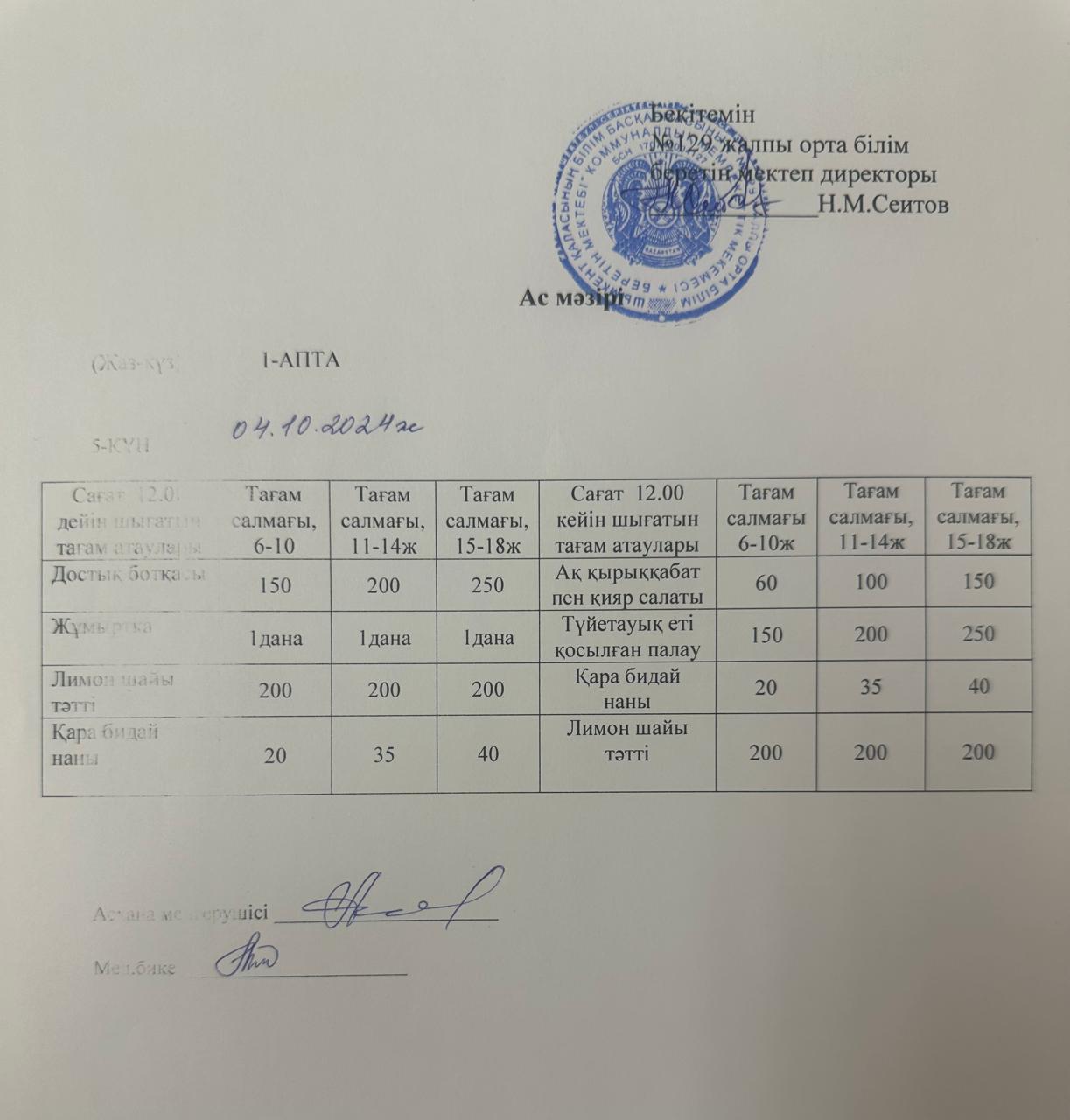 04.10.2024ж Бір күндік асхана мәзірі » №129 жалпы орта білім беретін мектеп