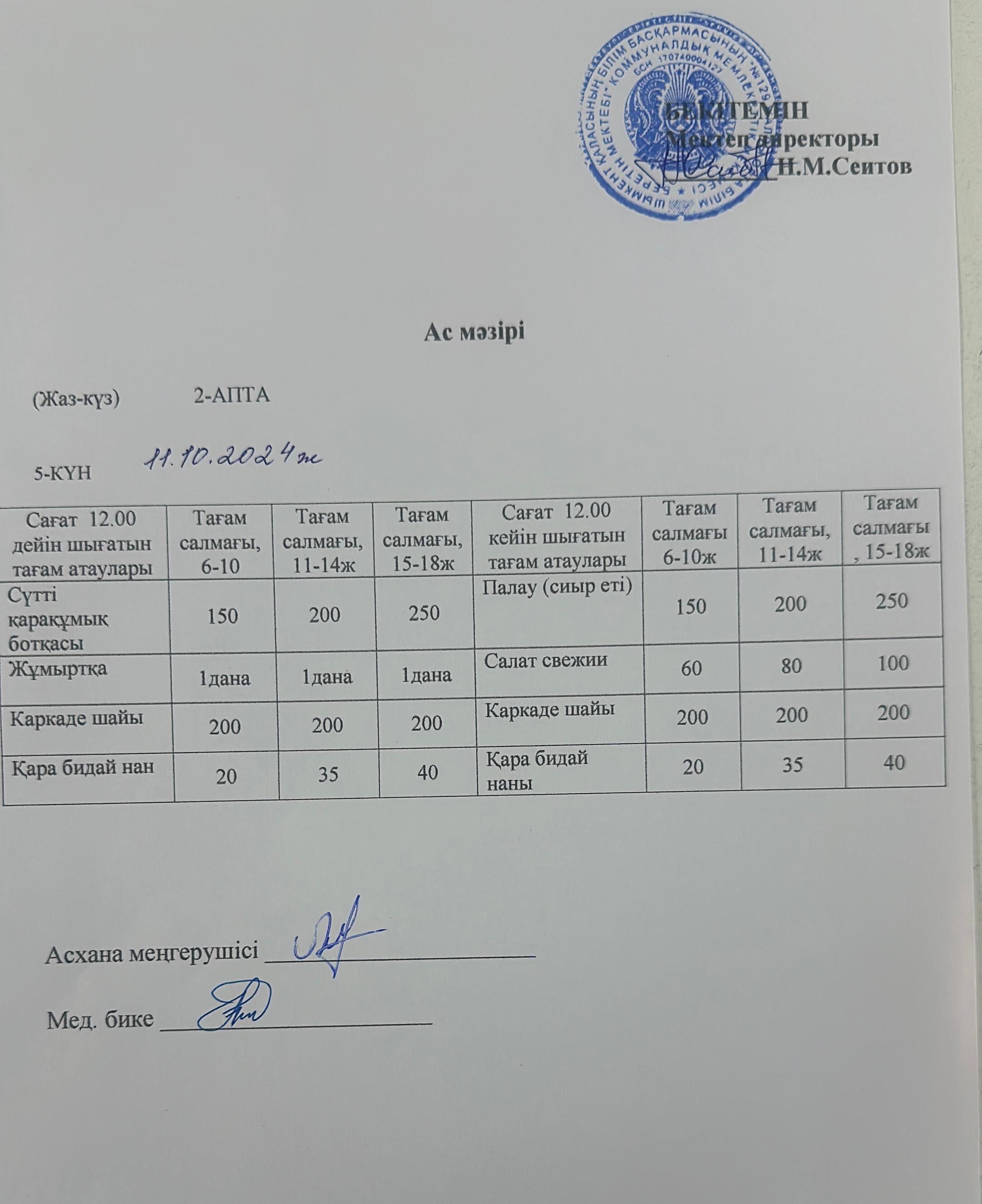 11.10.2024ж Бір күндік асхана мәзірі