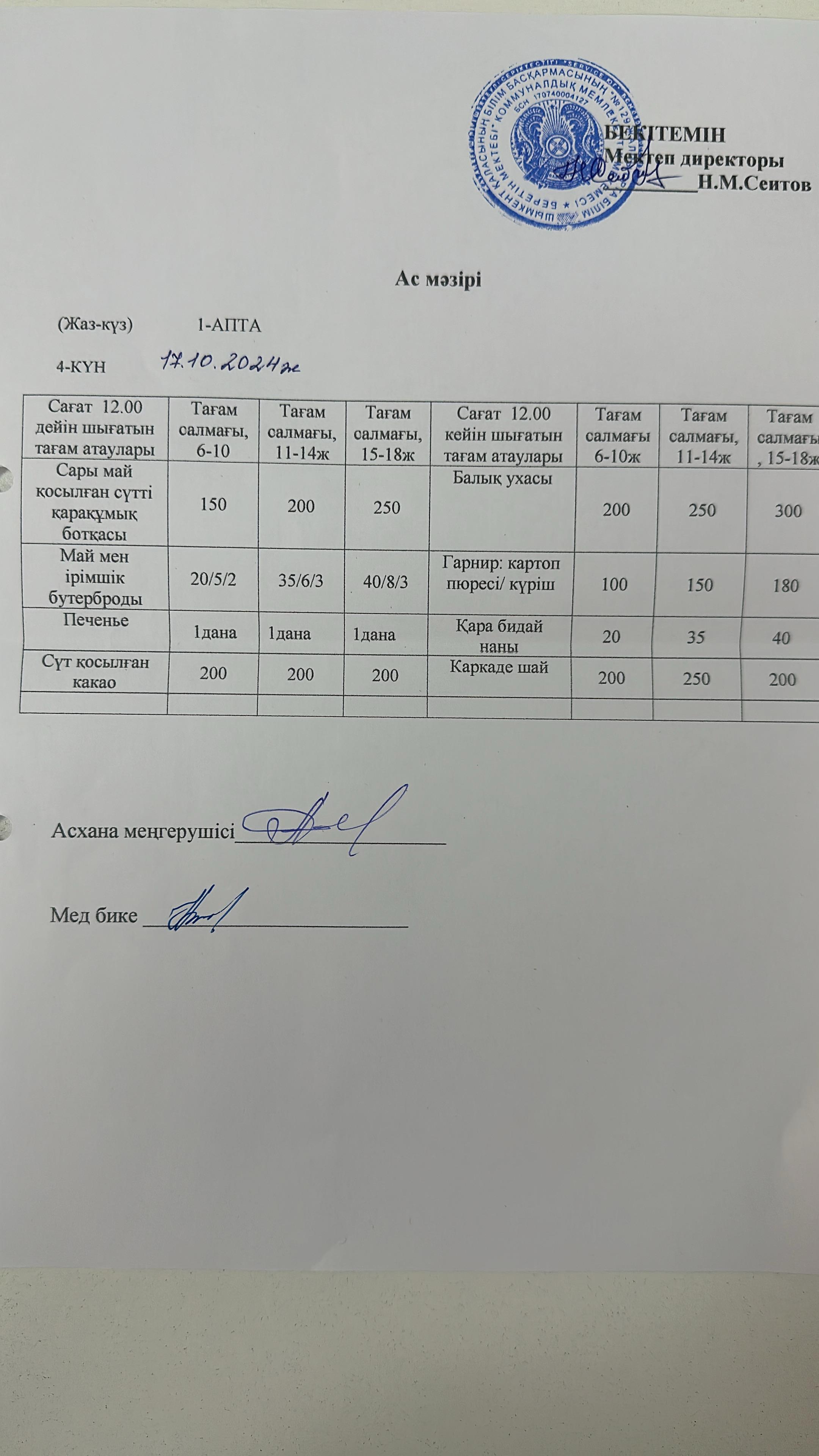 17.10.2024ж Бір күндік асхана мәзірі » №129 жалпы орта білім беретін мектеп