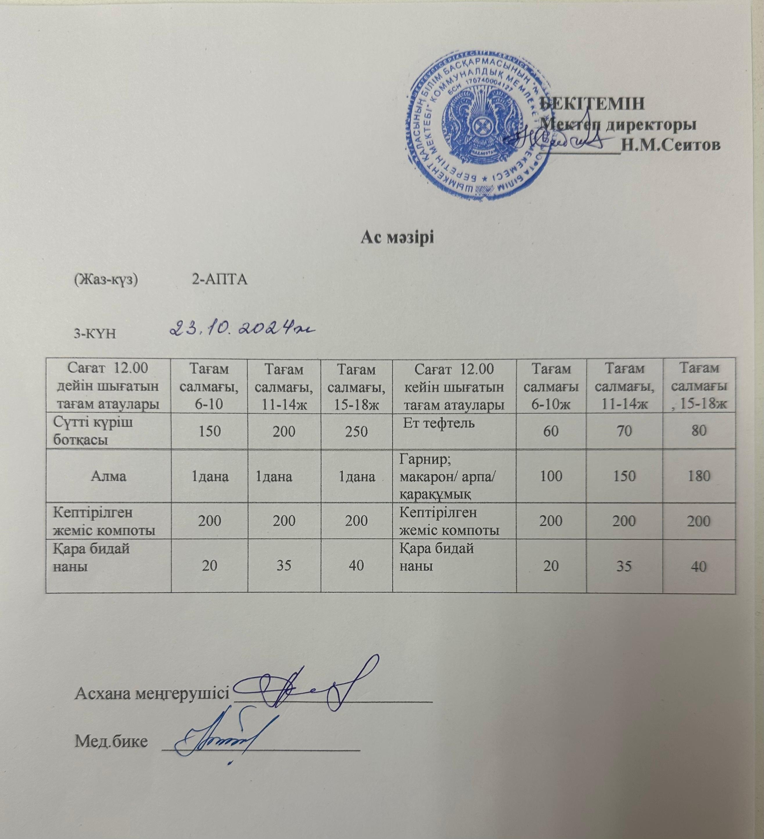 23.10.2024ж Бір күндік асхана мәзірі » №129 жалпы орта білім беретін мектеп