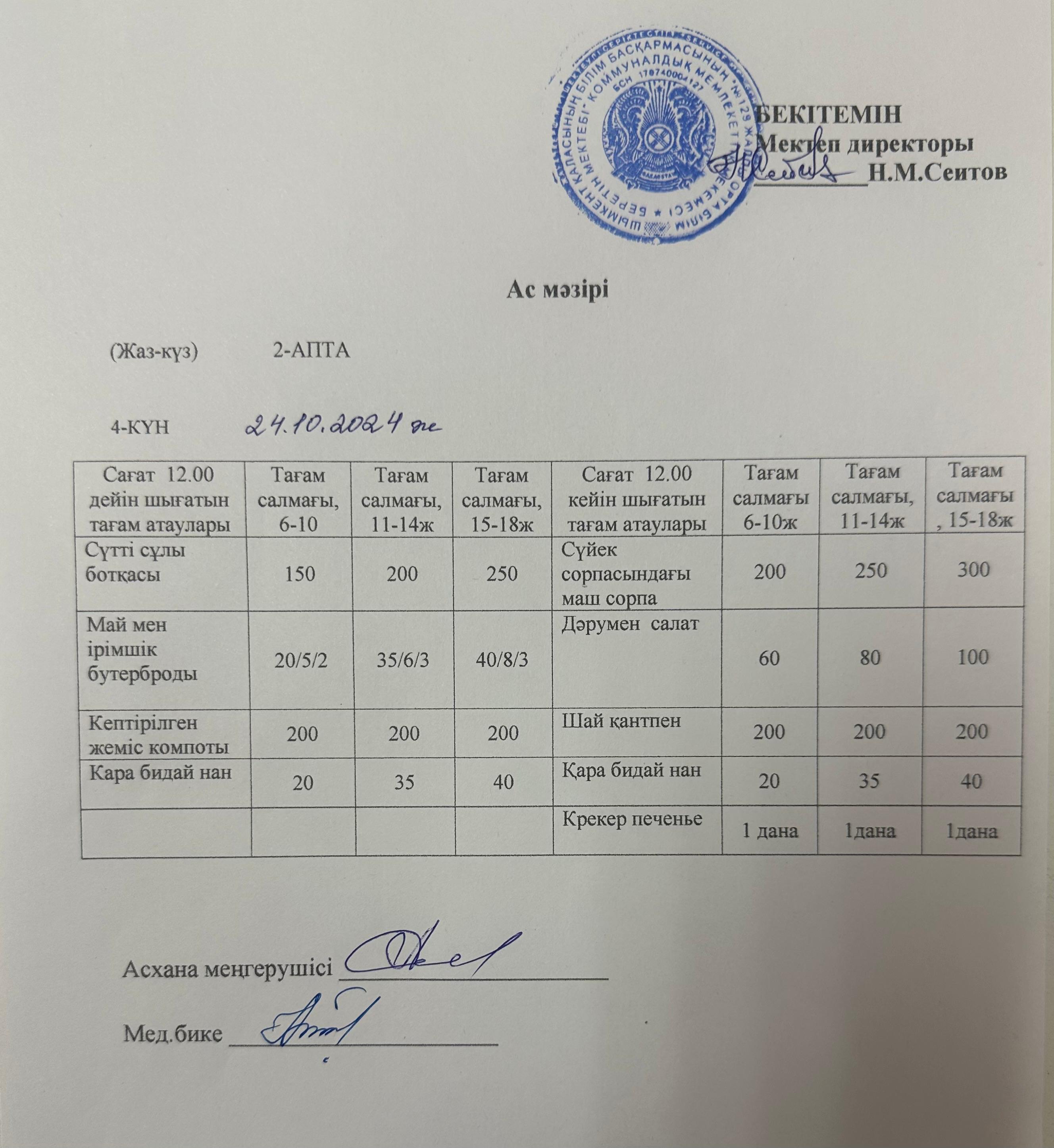 24.10.2024ж Бір күндік асхана мәзірі » №129 жалпы орта білім беретін мектеп