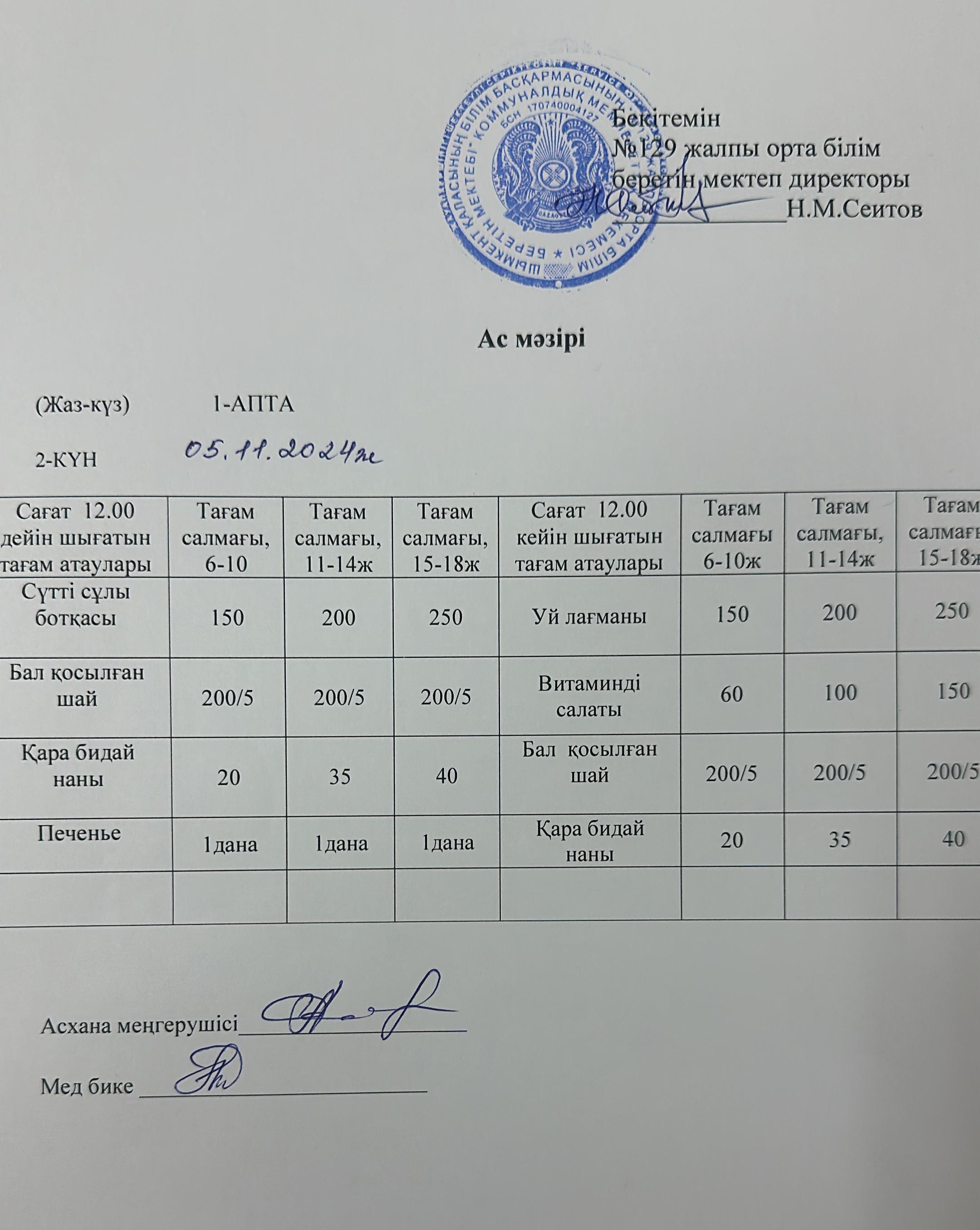 05.11.2024ж Бір күндік асхана мәзірі » №129 жалпы орта білім беретін мектеп