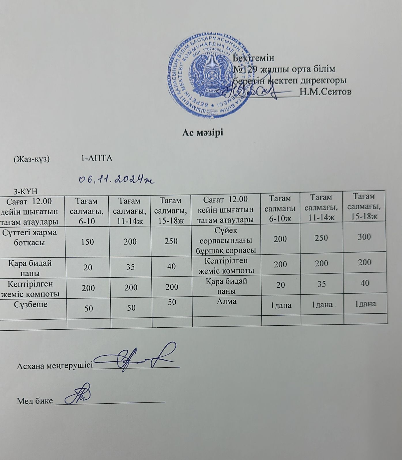 06.11.2024ж Бір күндік асхана мәзірі » №129 жалпы орта білім беретін мектеп