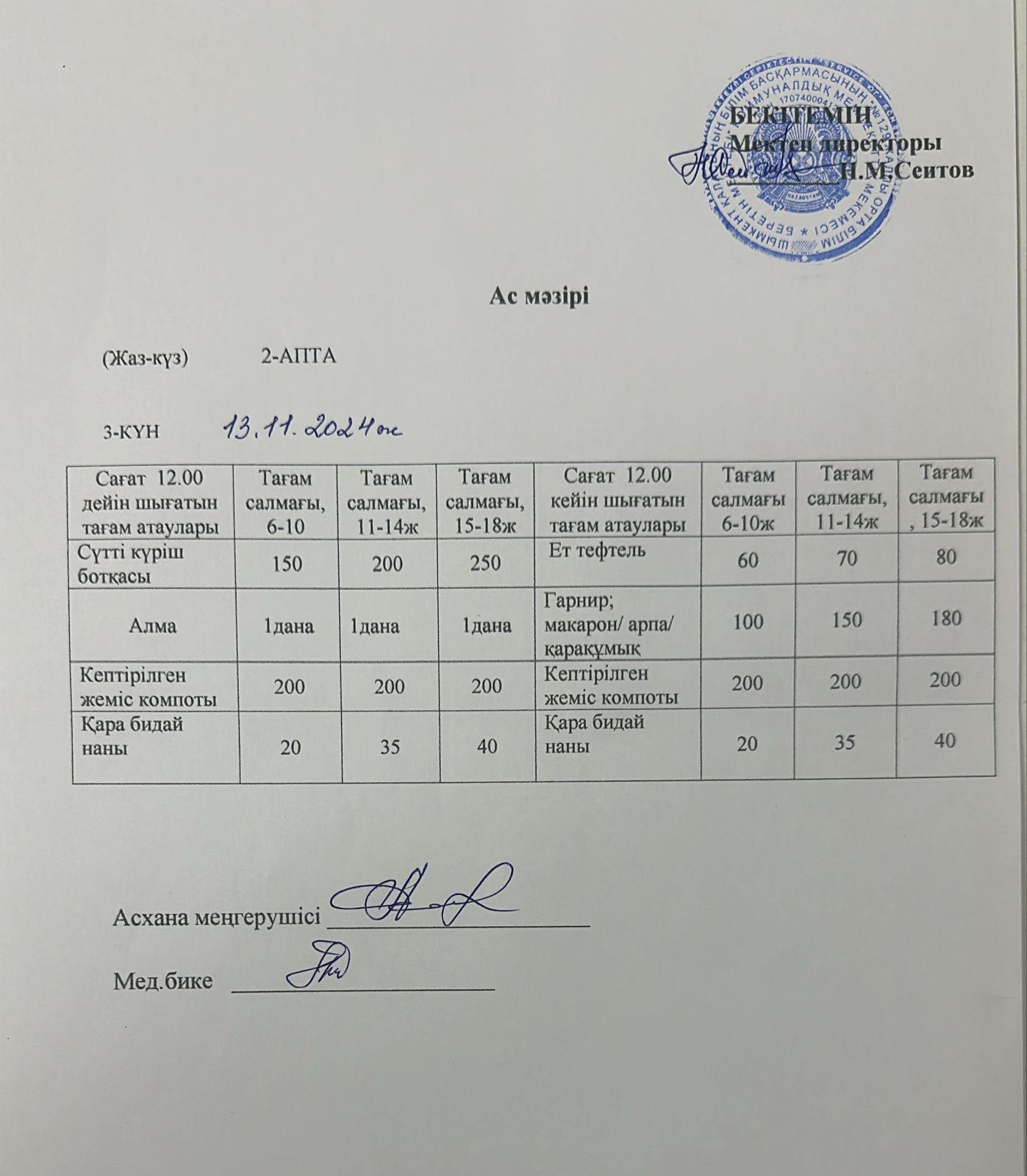 13.11.2024ж Бір күндік асхана мәзірі » №129 жалпы орта білім беретін мектеп