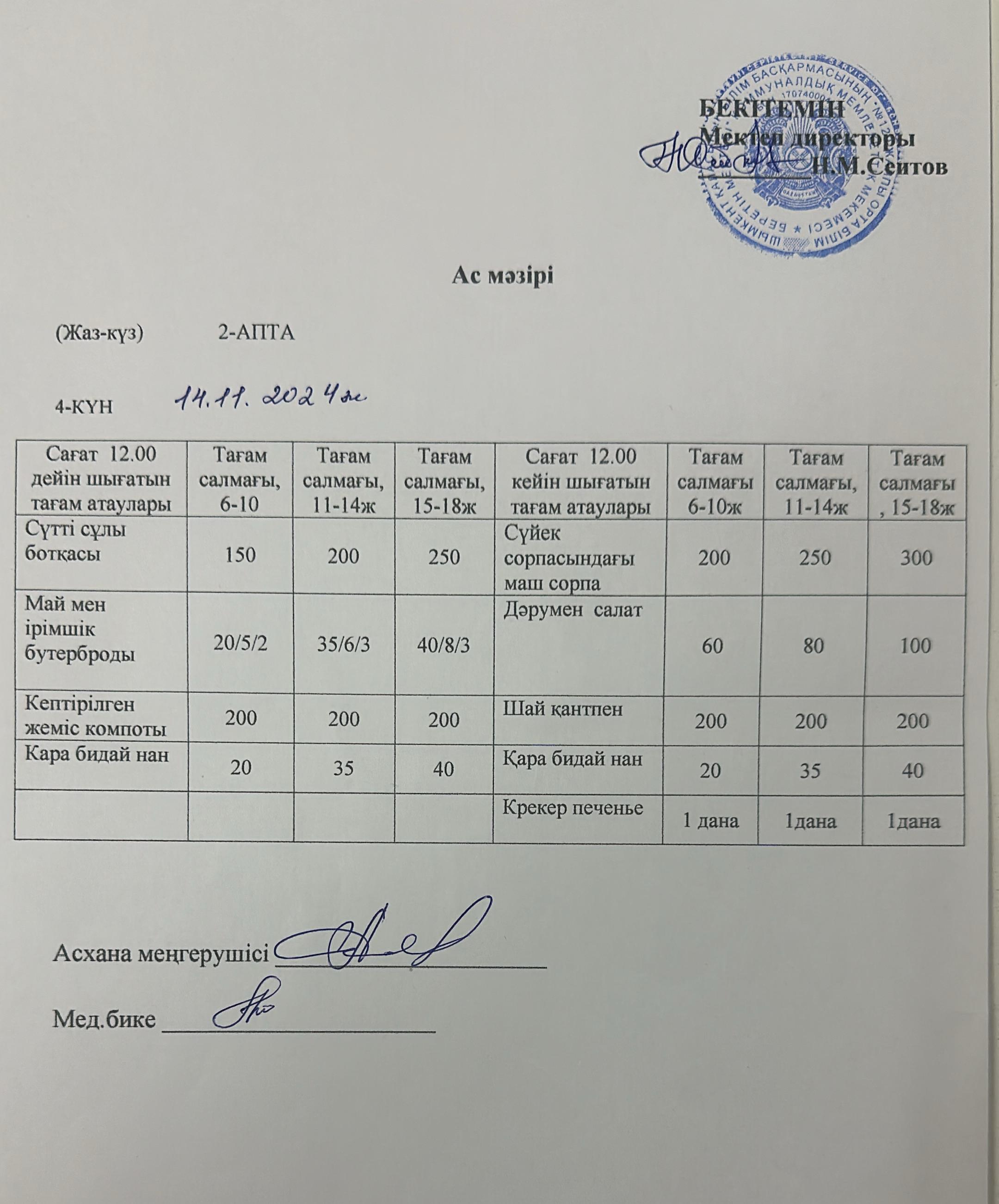 14.11.2024ж Бір күндік асхана мәзірі » №129 жалпы орта білім беретін мектеп