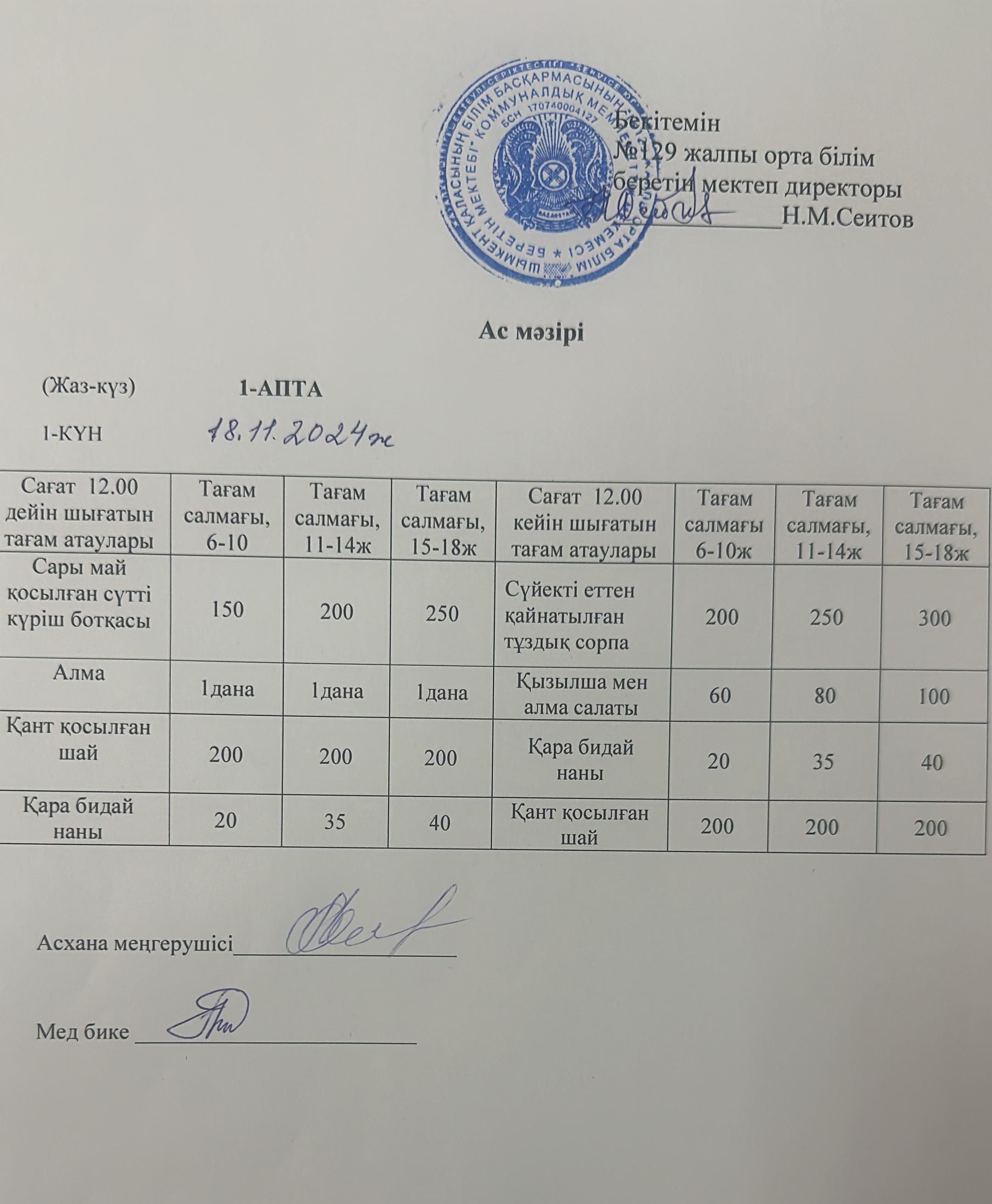 18.11.2024ж Бір күндік асхана мәзірі » №129 жалпы орта білім беретін мектеп