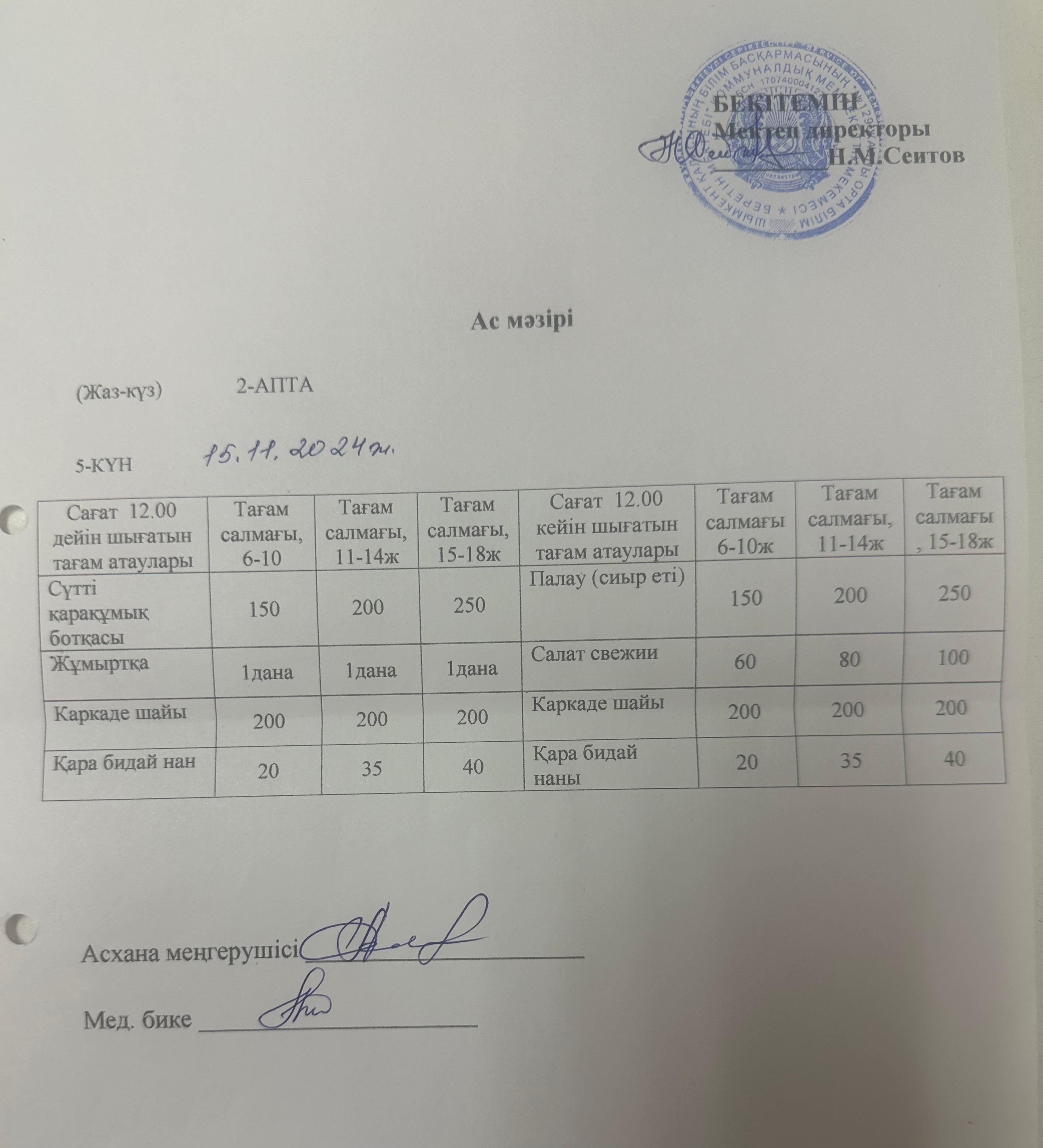 15.11.2024ж Бір күндік асхана мәзірі » №129 жалпы орта білім беретін мектеп