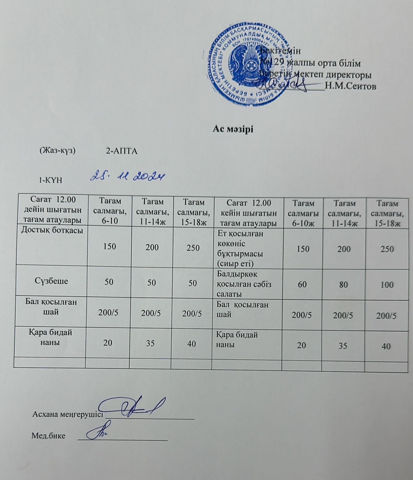 25.11.2024ж Бір күндік асхана мәзірі » №129 жалпы орта білім беретін мектеп