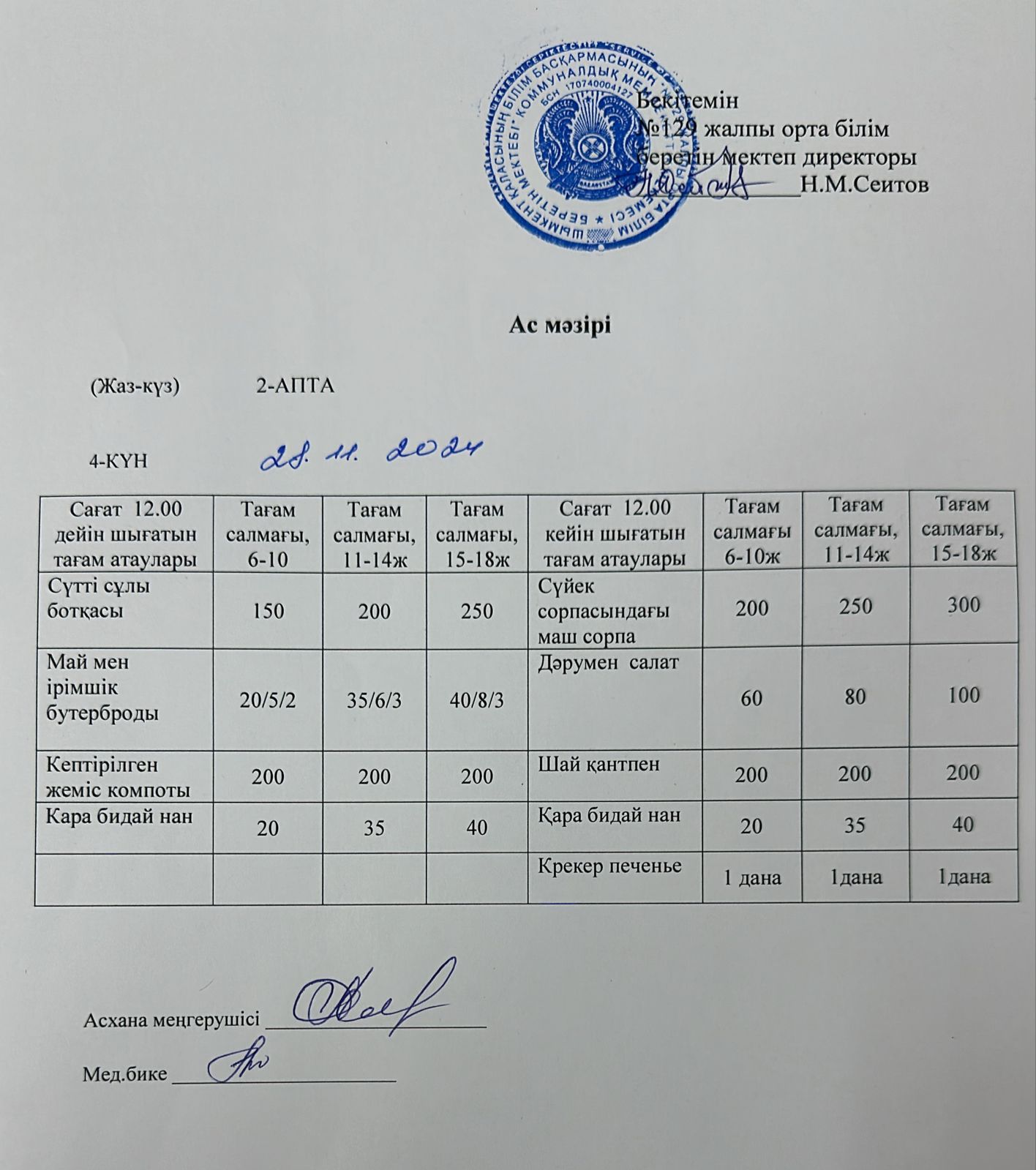 28.11.2024ж Бір күндік асхана мәзірі » №129 жалпы орта білім беретін мектеп