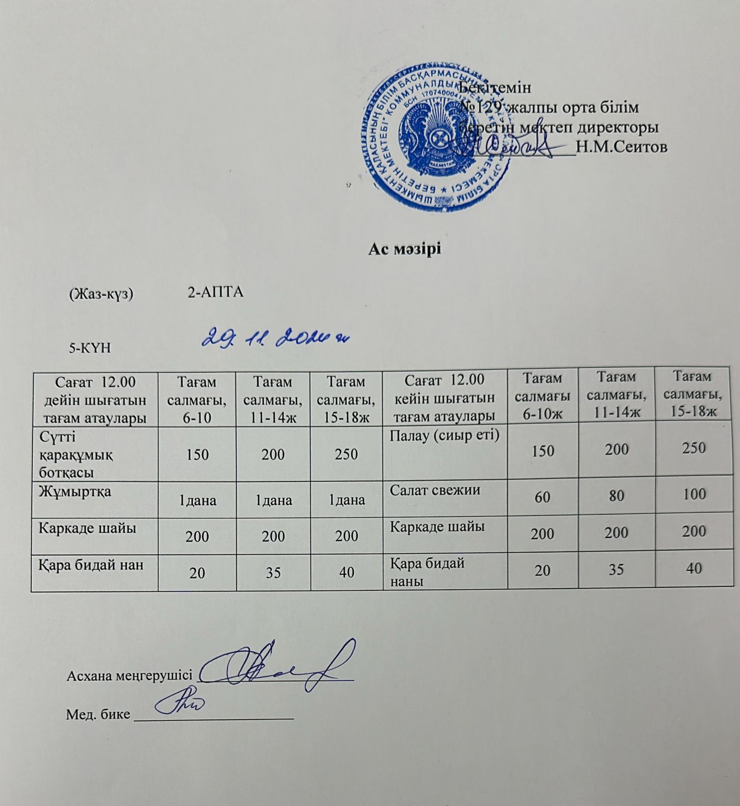 29.11.2024ж Бір күндік асхана мәзірі » №129 жалпы орта білім беретін мектеп