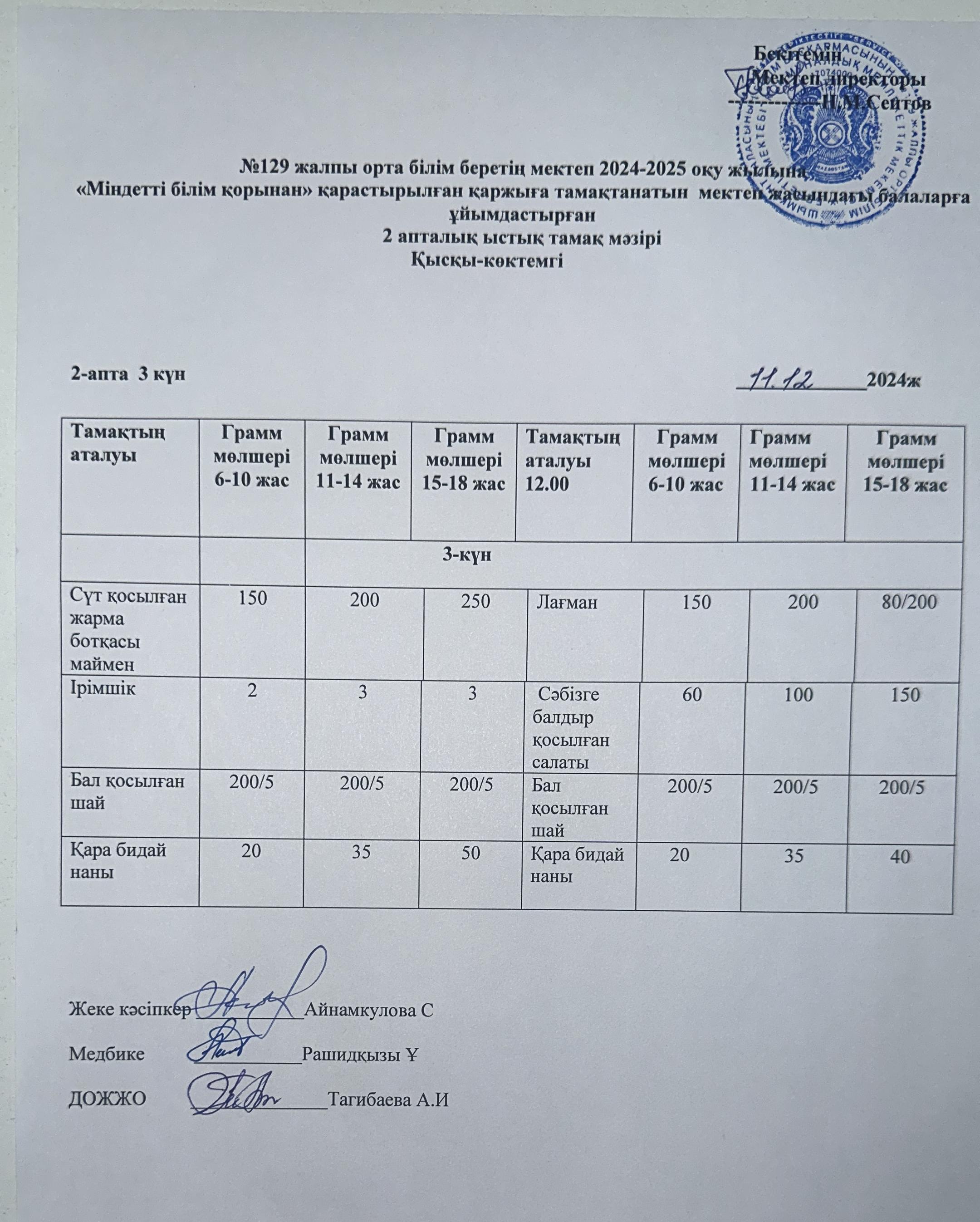 11.12.2024ж Бір күндік асхана мәзірі » №129 жалпы орта білім беретін мектеп