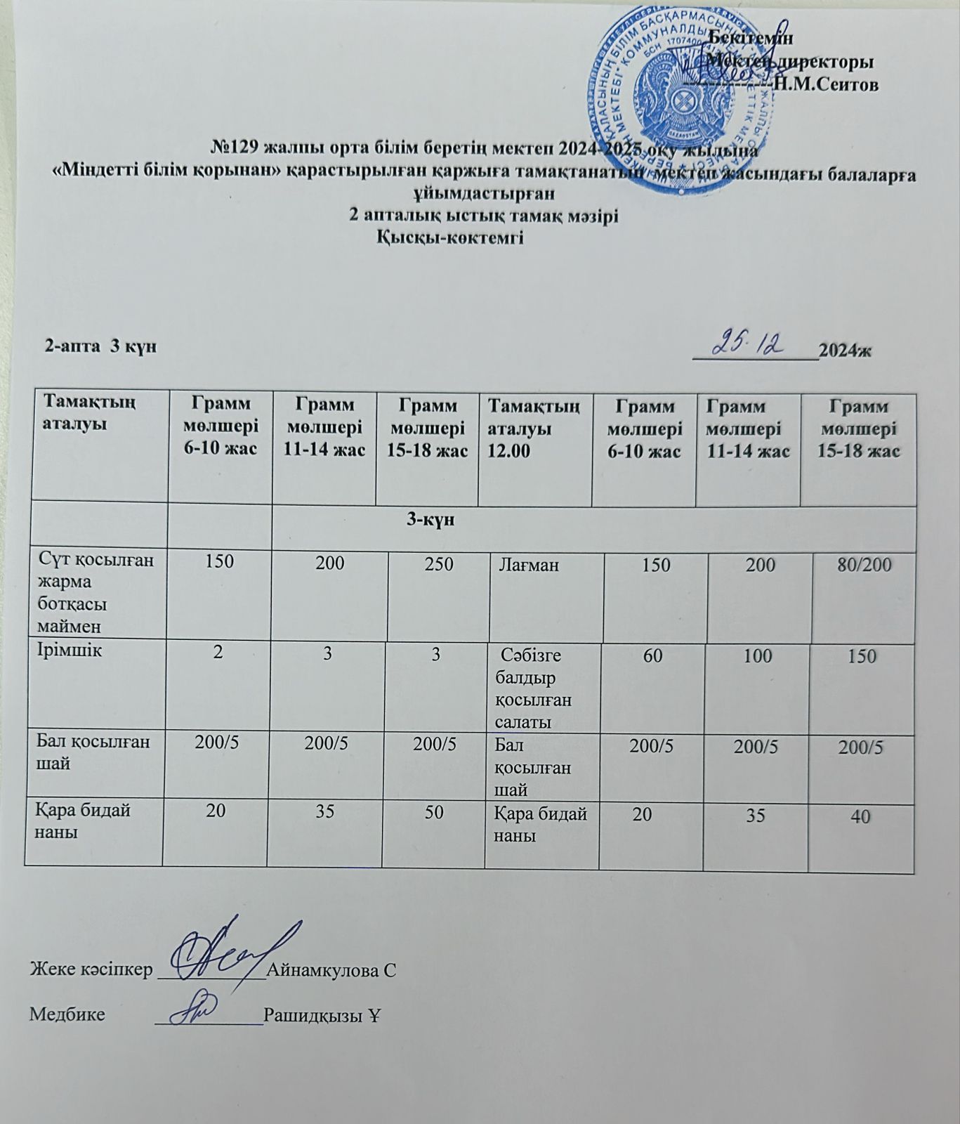 25.12.2024ж Бір күндік асхана мәзірі » №129 жалпы орта білім беретін мектеп