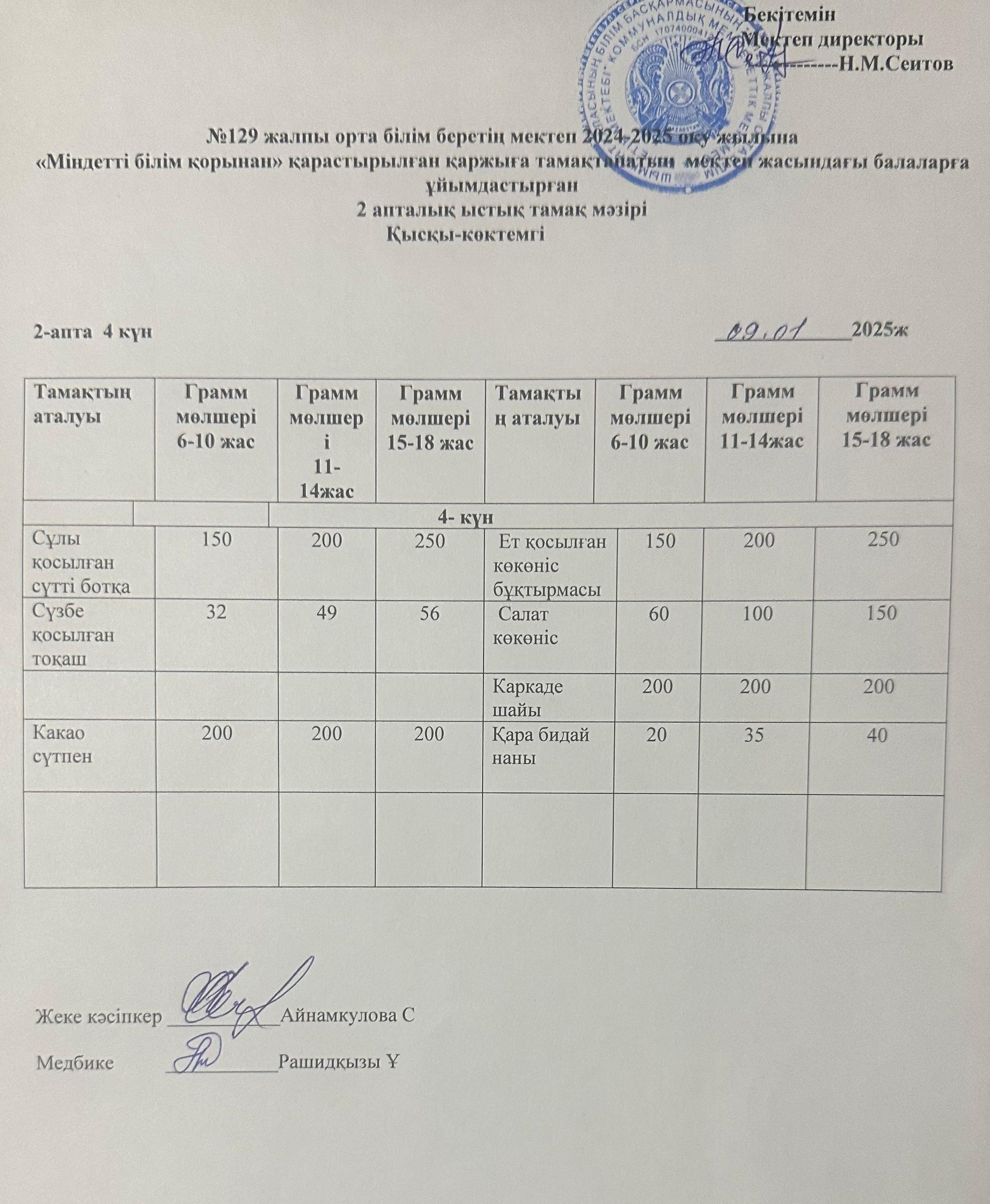 09.01.2025ж Бір күндік асхана мәзірі » №129 жалпы орта білім беретін мектеп