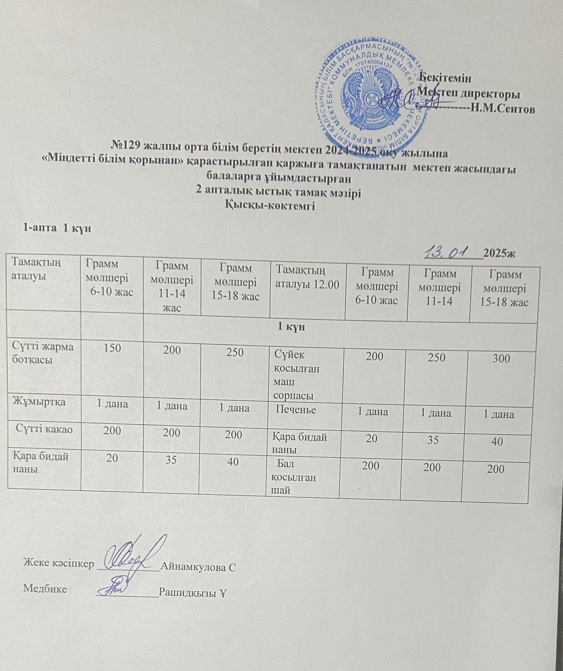 13.01.2025ж Бір күндік асхана мәзірі » №129 жалпы орта білім беретін мектеп