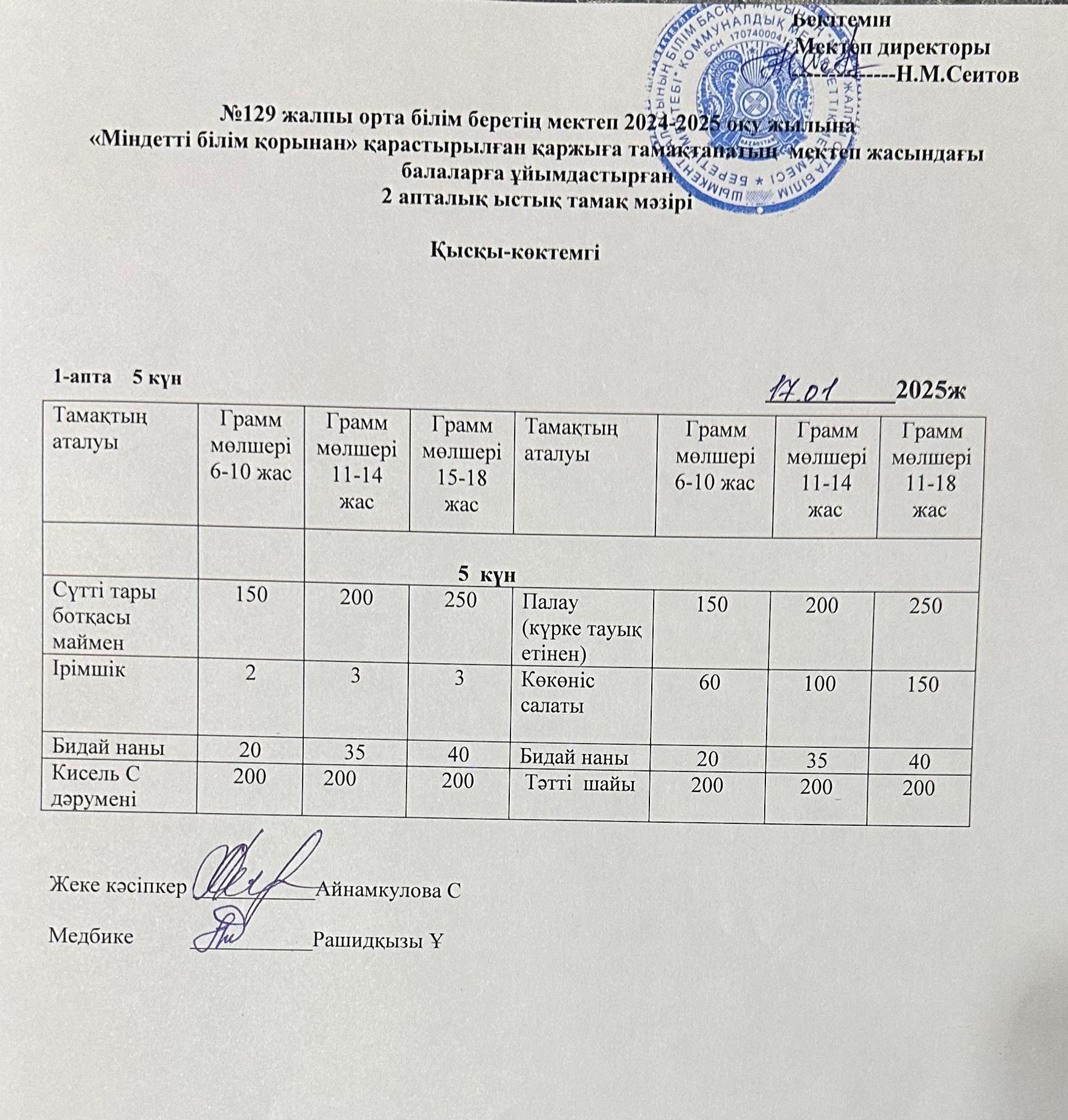 17.01.2025ж Бір күндік асхана мәзірі » №129 жалпы орта білім беретін мектеп
