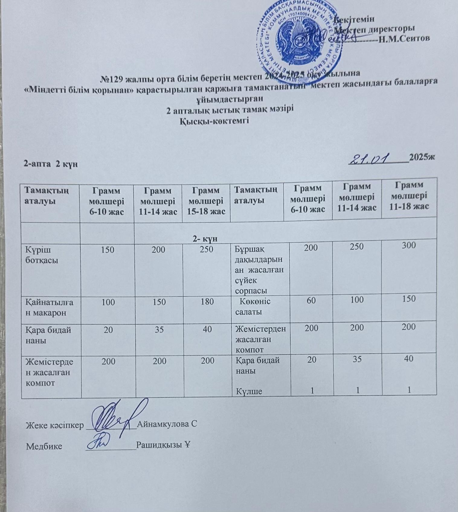 21.01.2025ж Бір күндік асхана мәзірі » №129 жалпы орта білім беретін мектеп