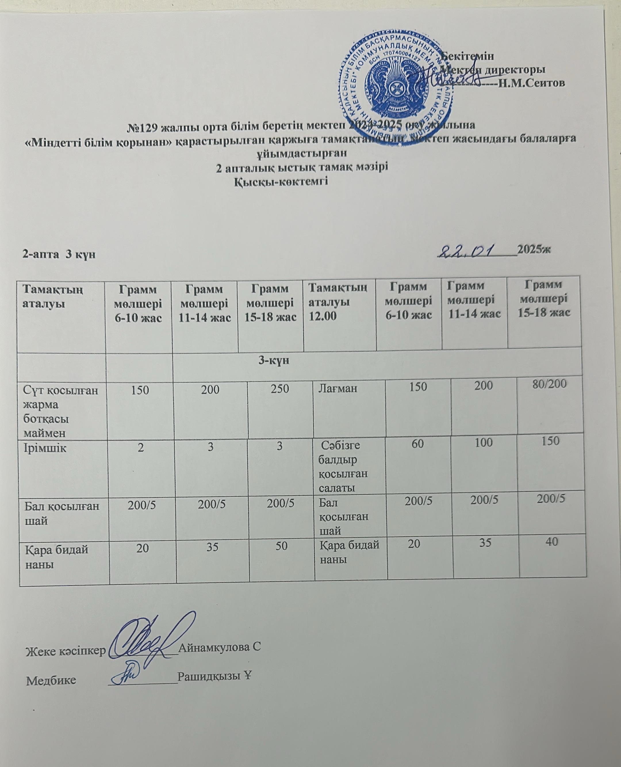 22.01.2025ж Бір күндік асхана мәзірі » №129 жалпы орта білім беретін мектеп