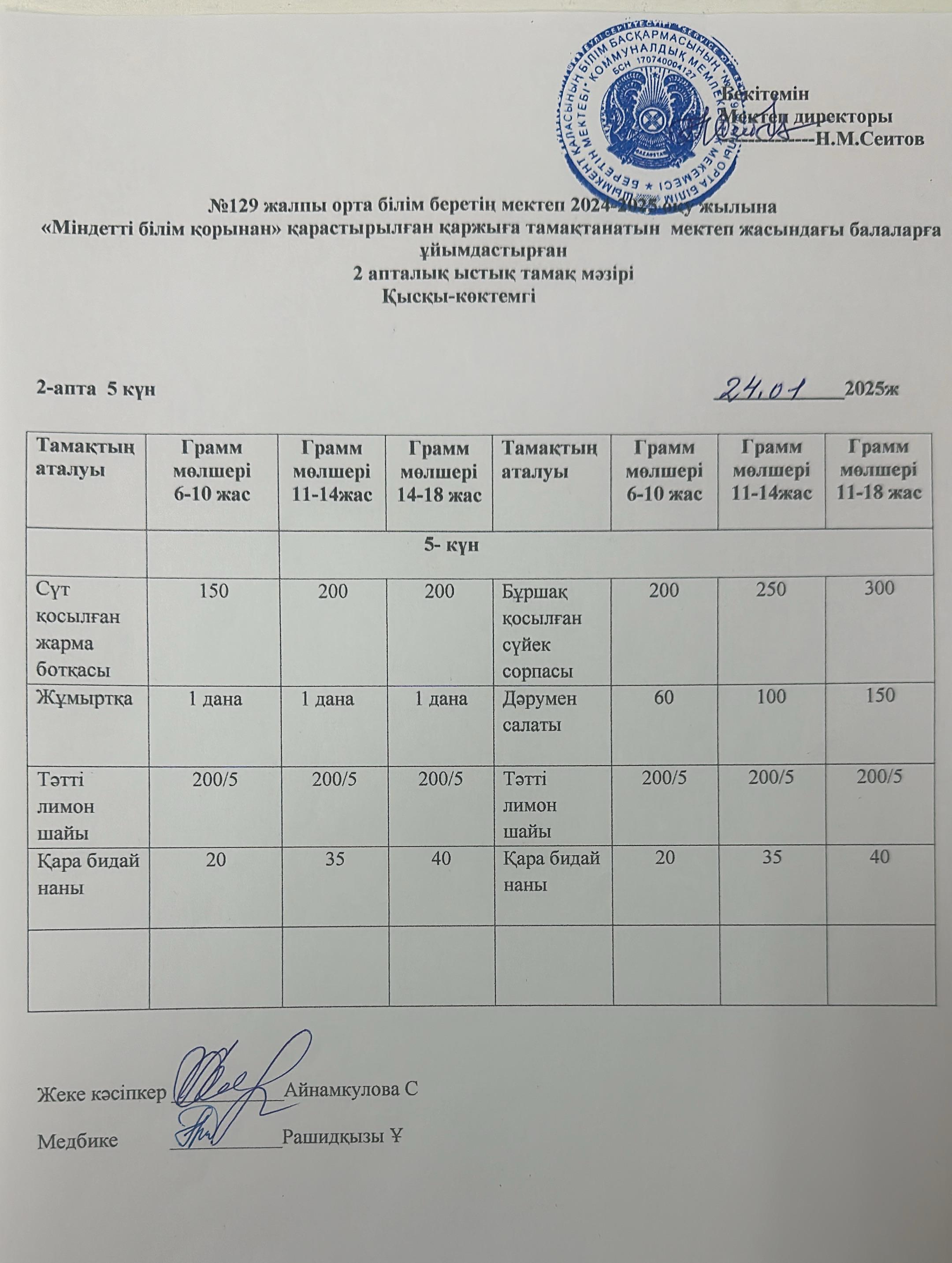 24.01.2025ж Бір күндік асхана мәзірі » №129 жалпы орта білім беретін мектеп