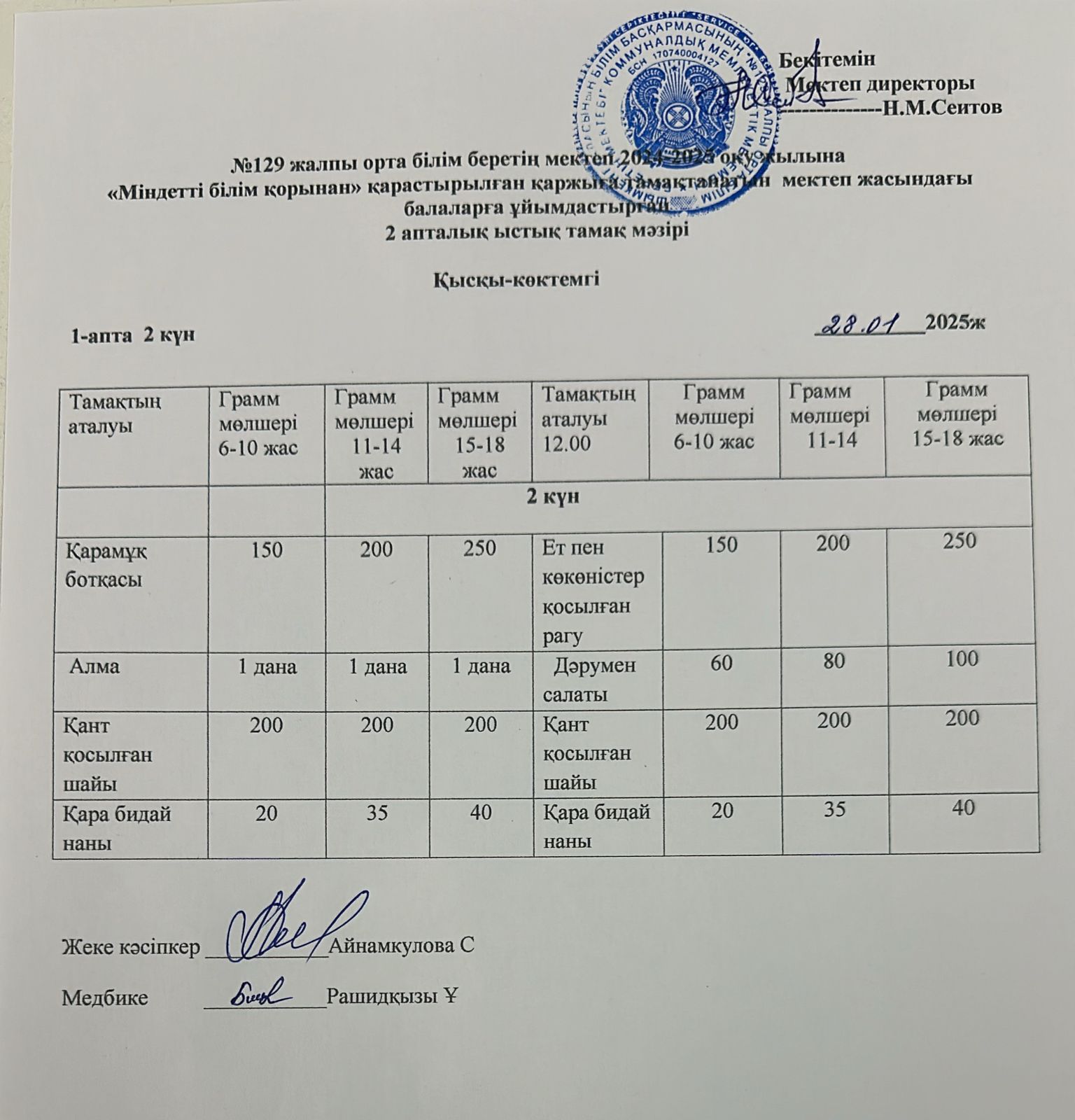 28.01.2025ж Бір күндік асхана мәзірі » №129 жалпы орта білім беретін мектеп