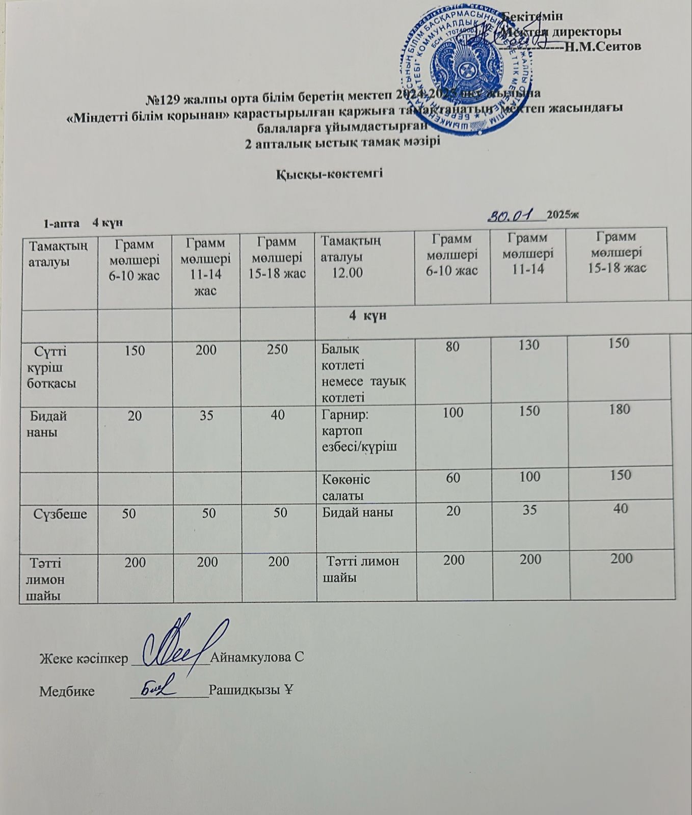 30.01.2025ж Бір күндік асхана мәзірі » №129 жалпы орта білім беретін мектеп