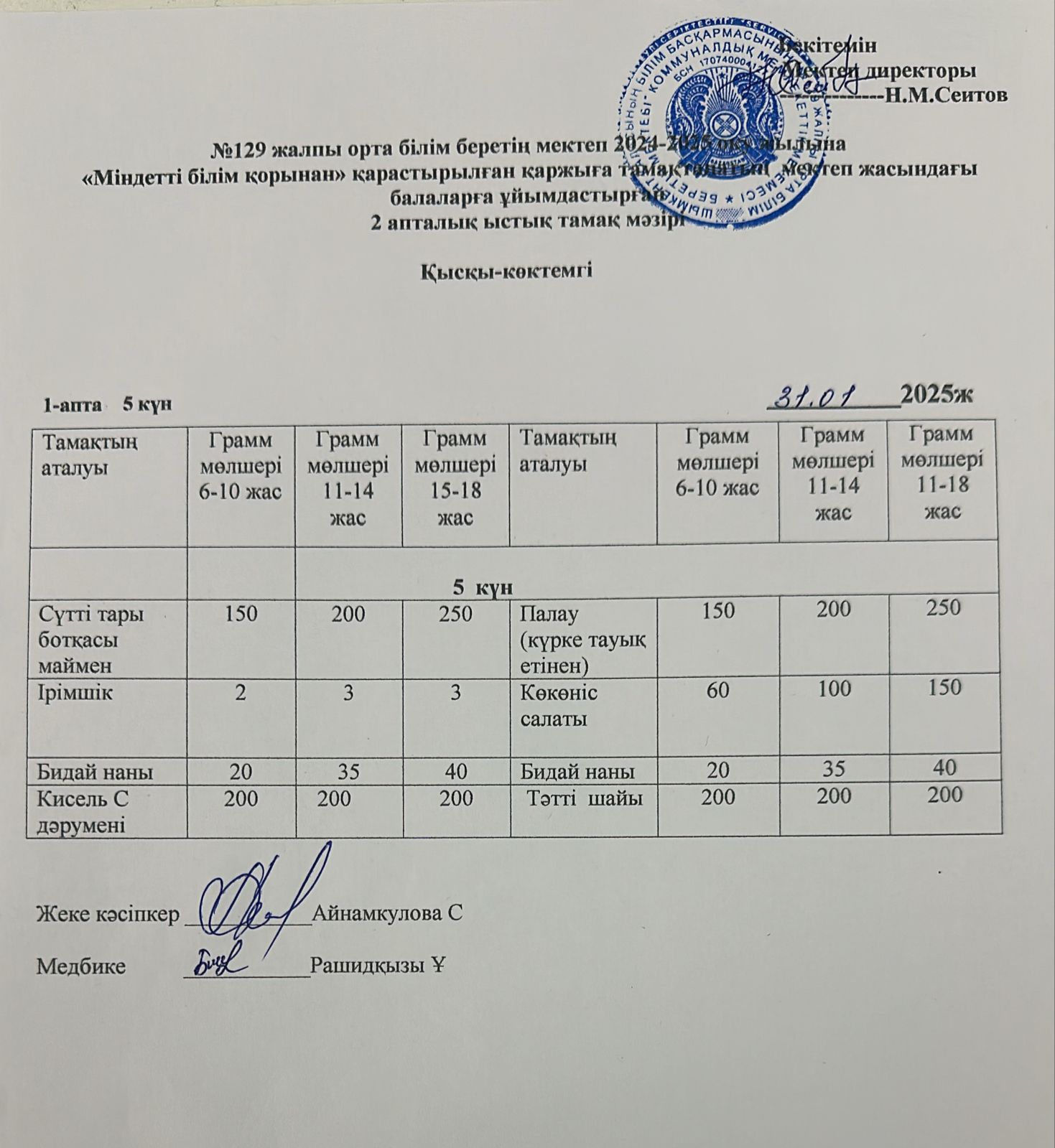 31.01.2025ж Бір күндік асхана мәзірі » №129 жалпы орта білім беретін мектеп
