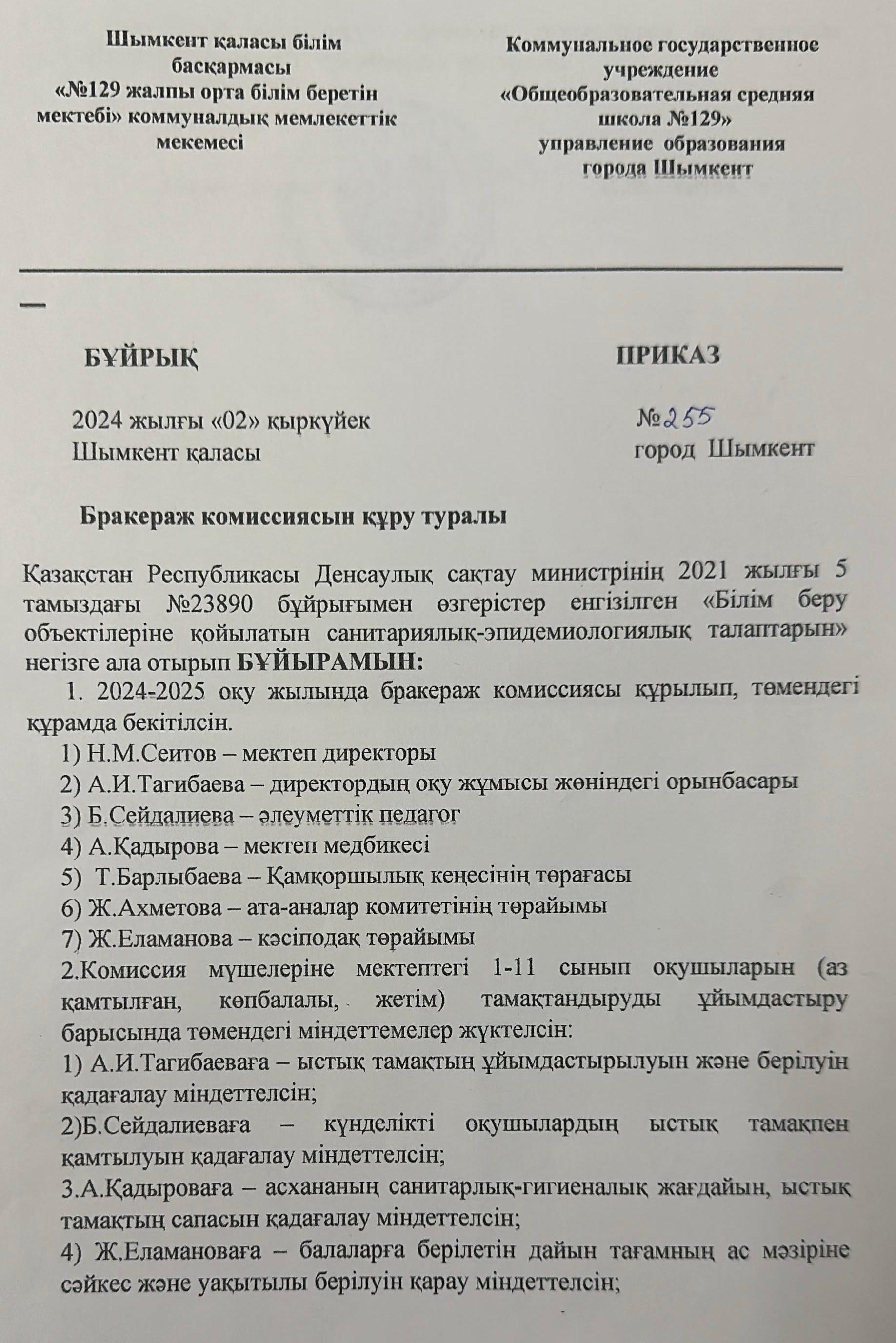02.09.2024ж Бракераж комиссиясын құру туралы бұйрығы » №129 жалпы орта білім беретін мектеп