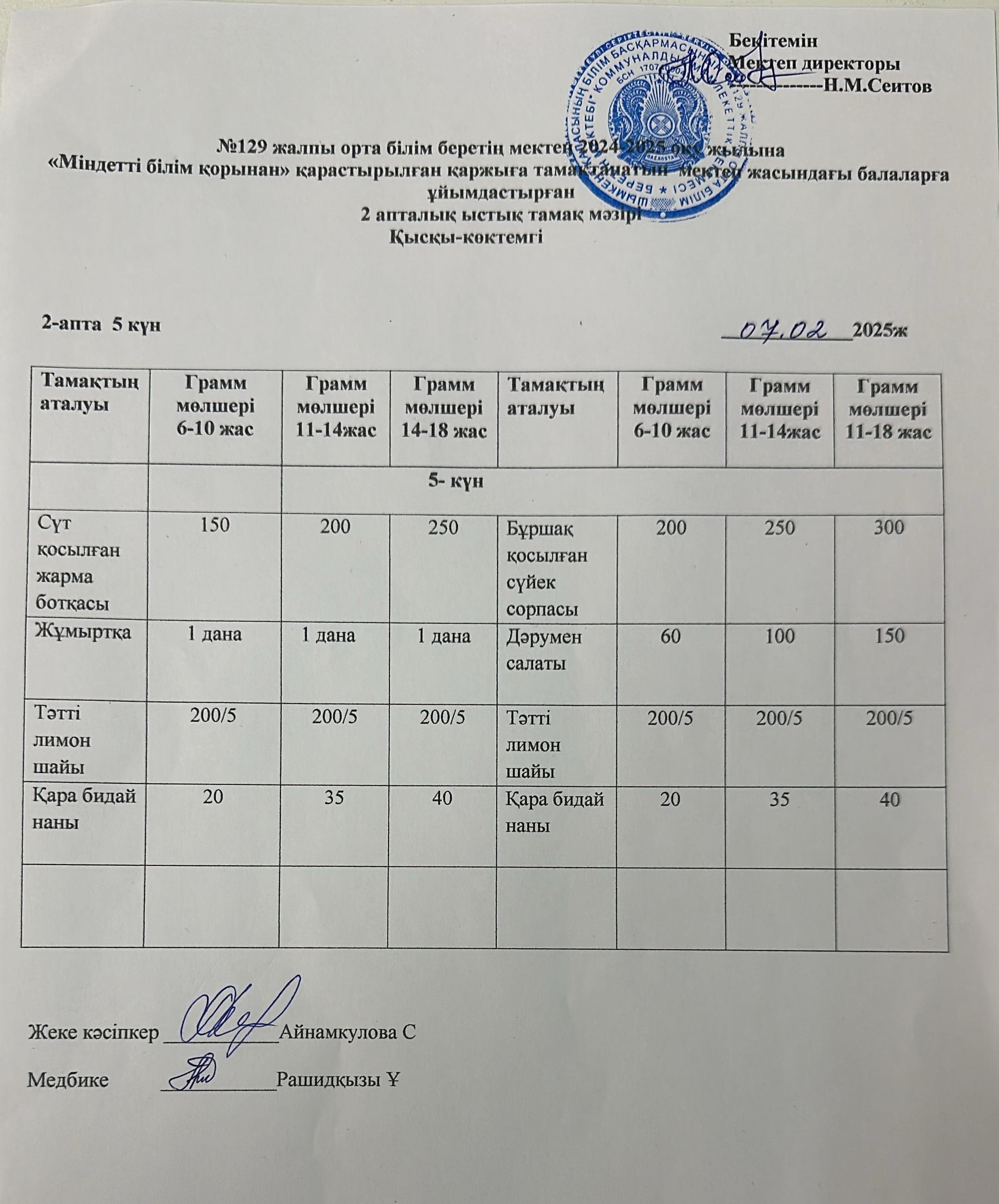 07.02.2025ж Бір күндік асхана мәзірі » №129 жалпы орта білім беретін мектеп