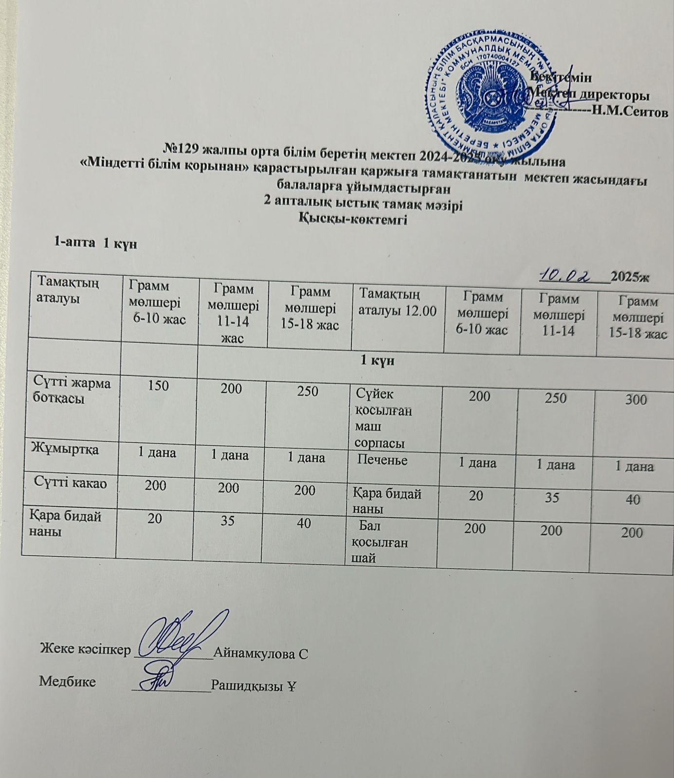 10.02.2025ж Бір күндік асхана мәзірі » №129 жалпы орта білім беретін мектеп