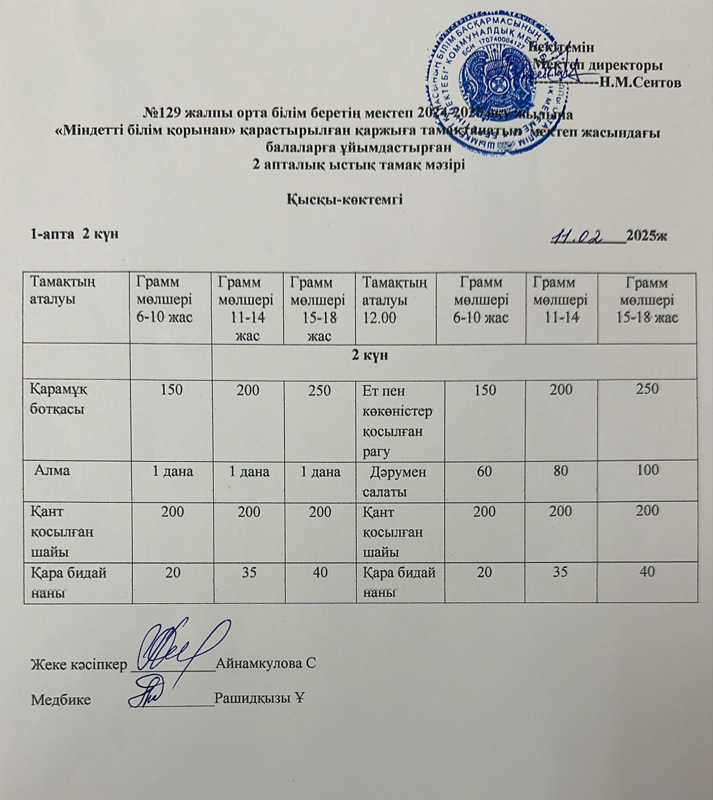 11.02.2025ж Бір күндік асхана мәзірі » №129 жалпы орта білім беретін мектеп