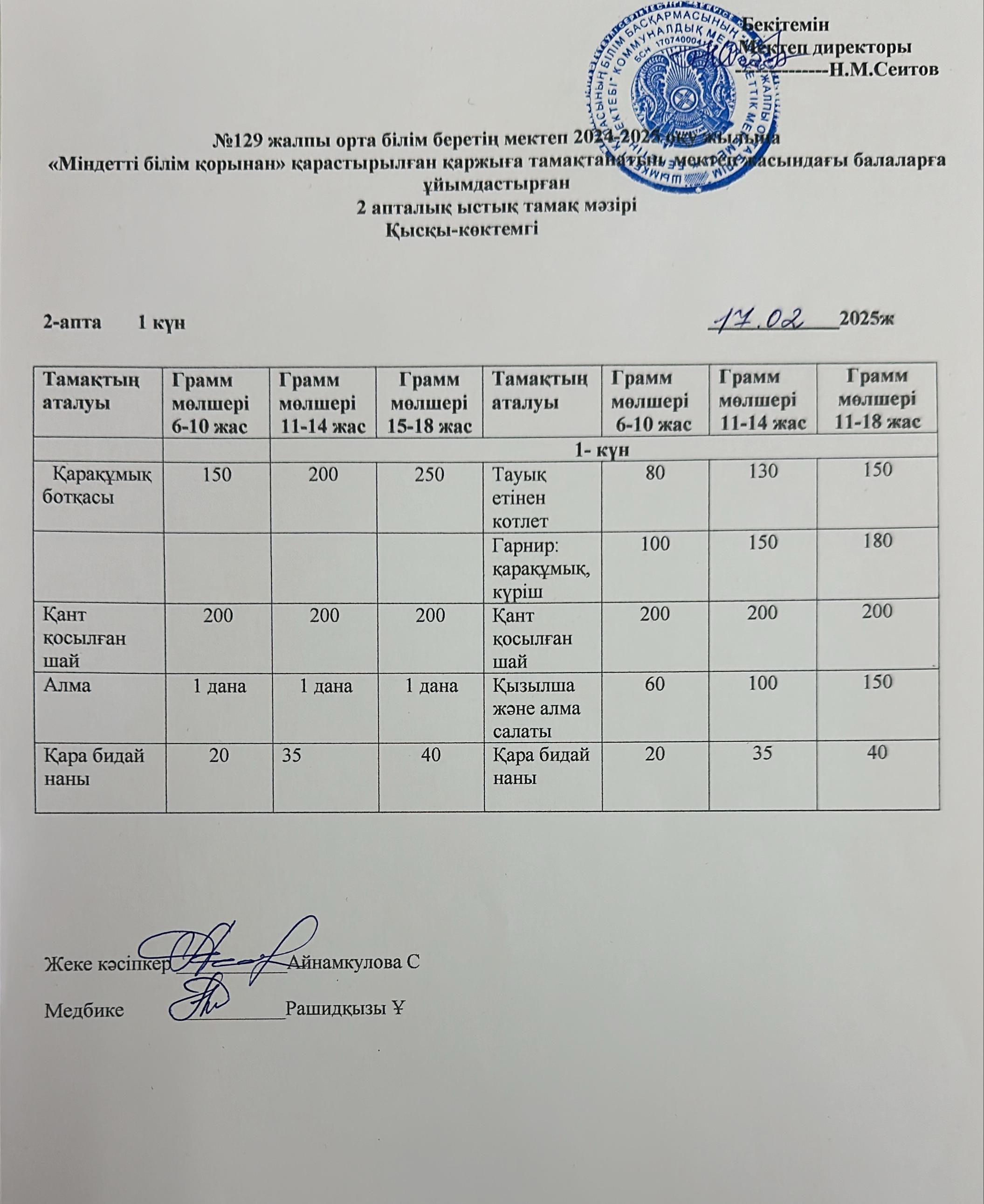 17.02.2025ж Бір күндік асхана мәзірі » №129 жалпы орта білім беретін мектеп
