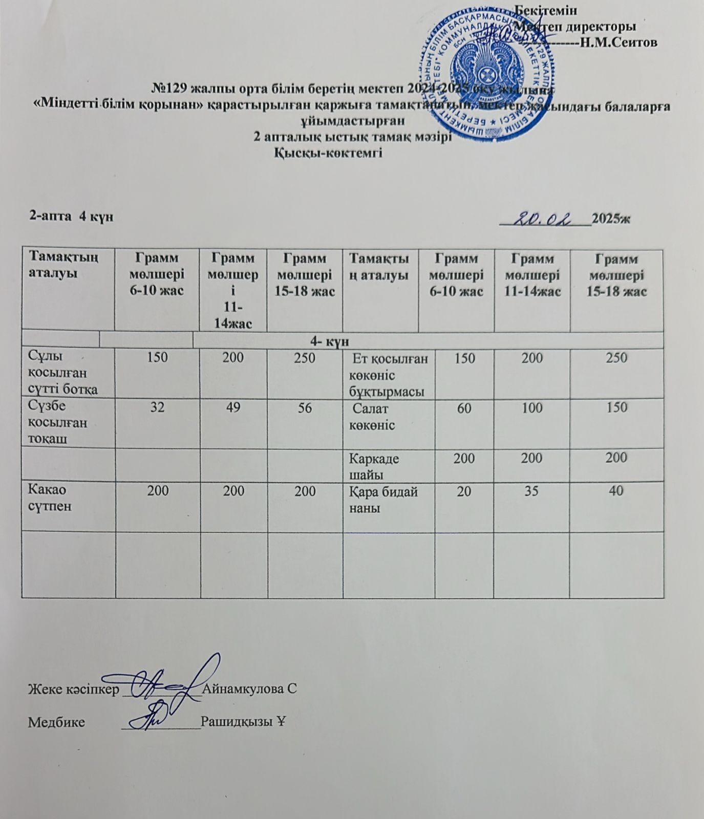 20.02.2025ж Бір күндік асхана мәзірі » №129 жалпы орта білім беретін мектеп