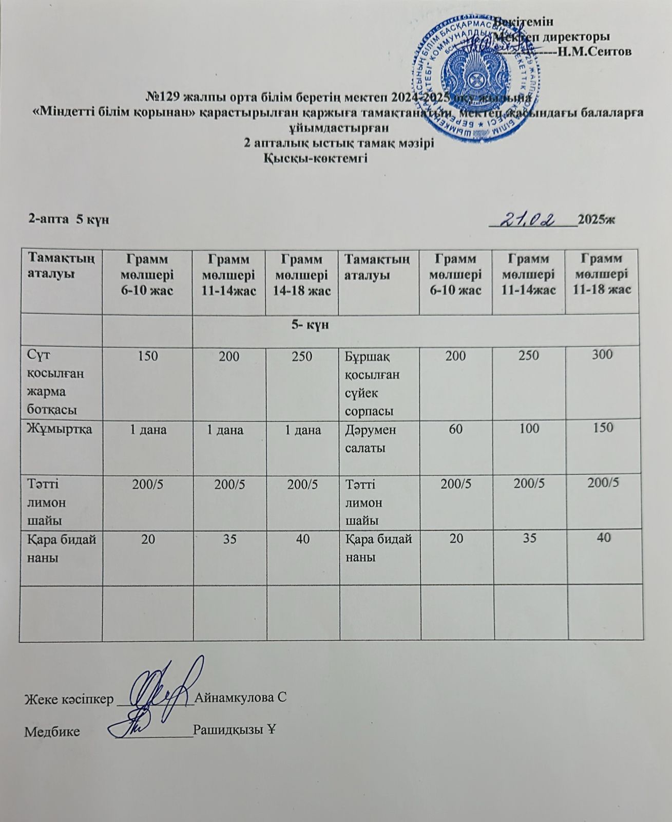 21.02.2025ж Бір күндік асхана мәзірі » №129 жалпы орта білім беретін мектеп