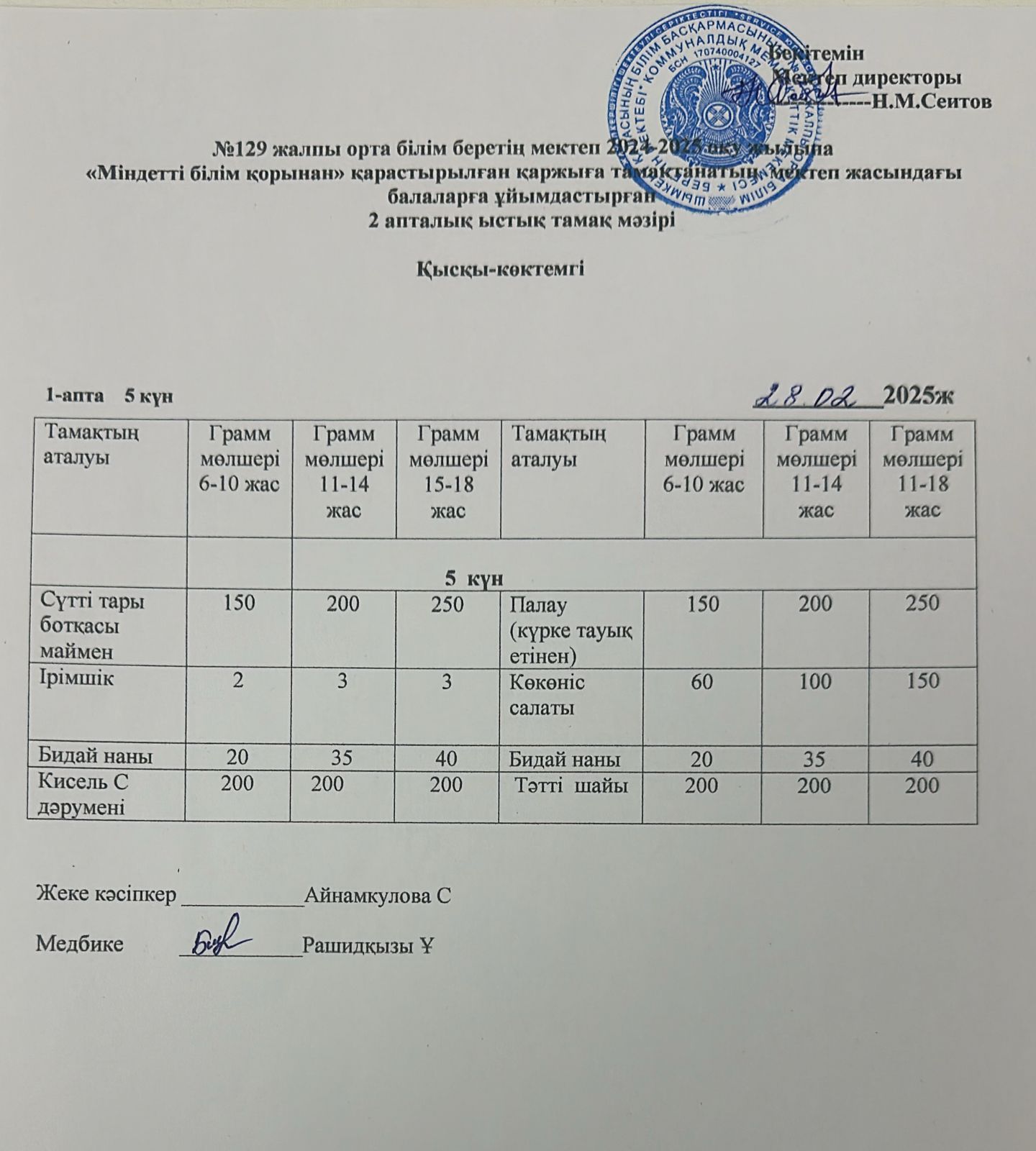 28.02.2025ж Бір күндік асхана мәзірі » №129 жалпы орта білім беретін мектеп
