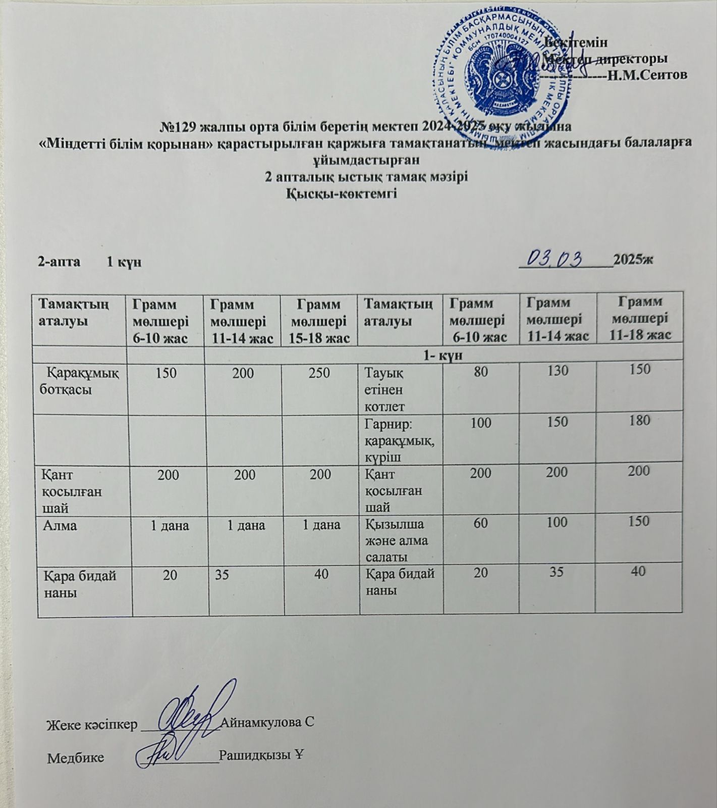03.03.2025ж Бір күндік асхана мәзірі » №129 жалпы орта білім беретін мектеп