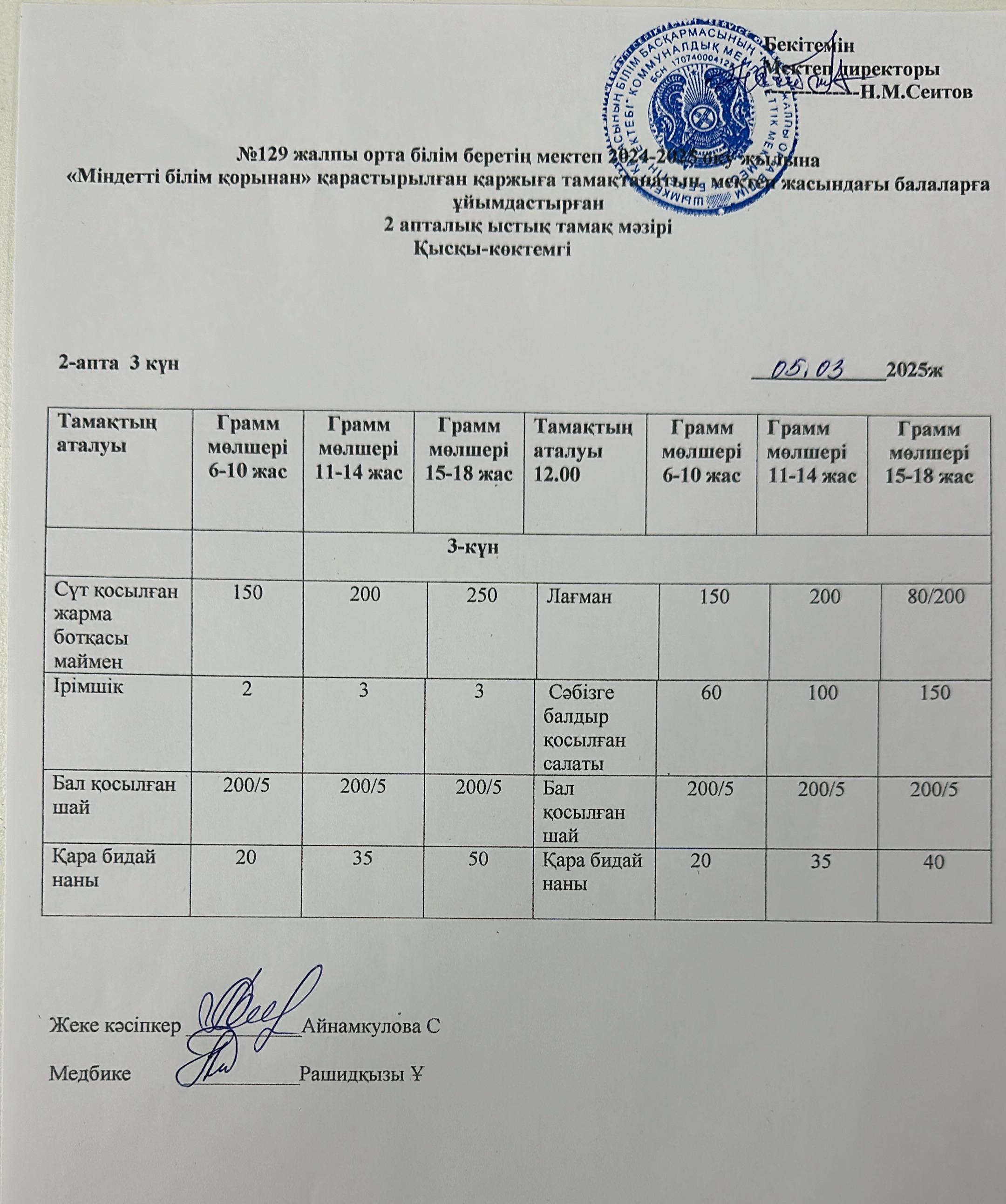 05.03.2025ж Бір күндік асхана мәзірі » №129 жалпы орта білім беретін мектеп