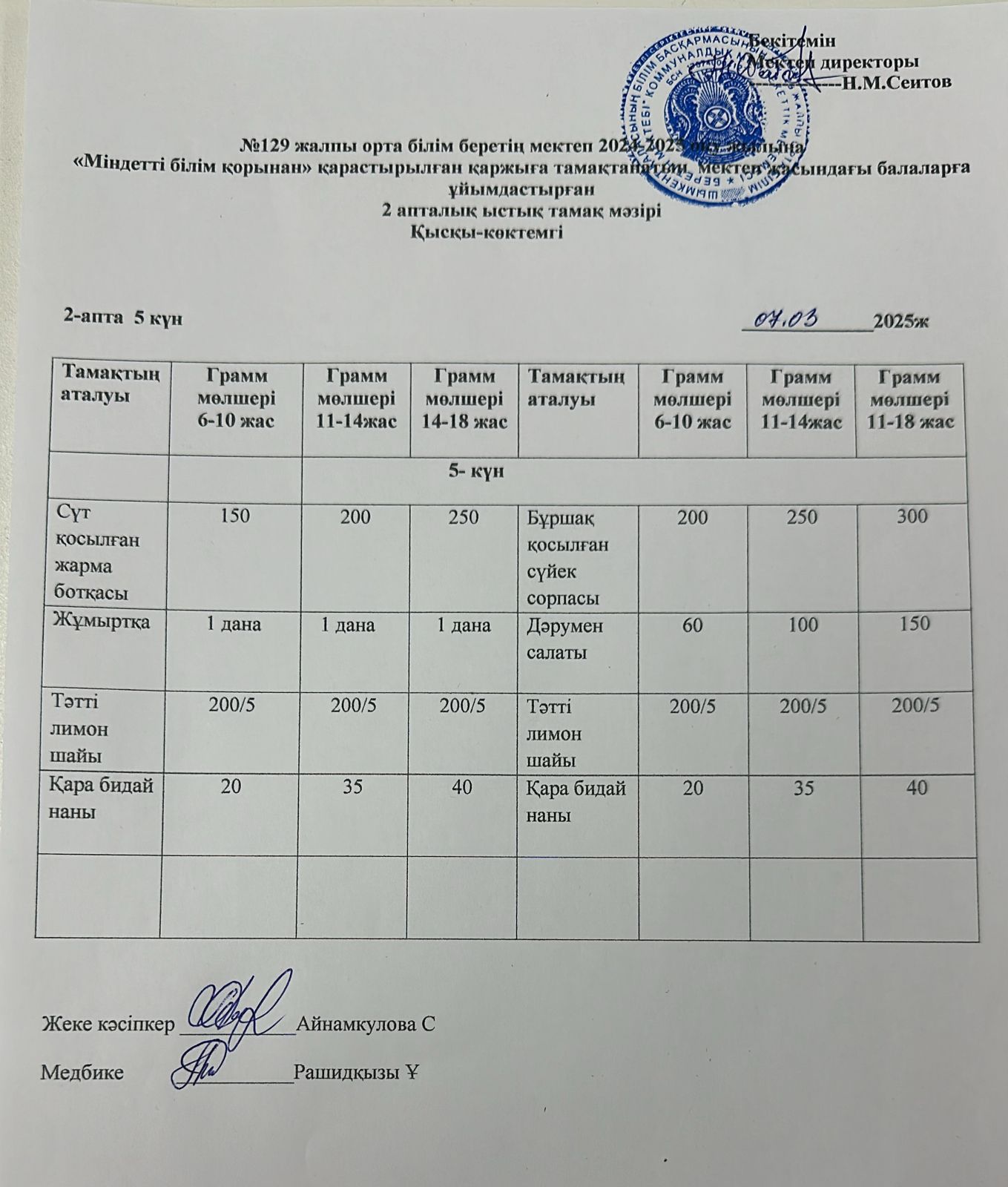 07.03.2025ж Бір күндік асхана мәзірі » №129 жалпы орта білім беретін мектеп