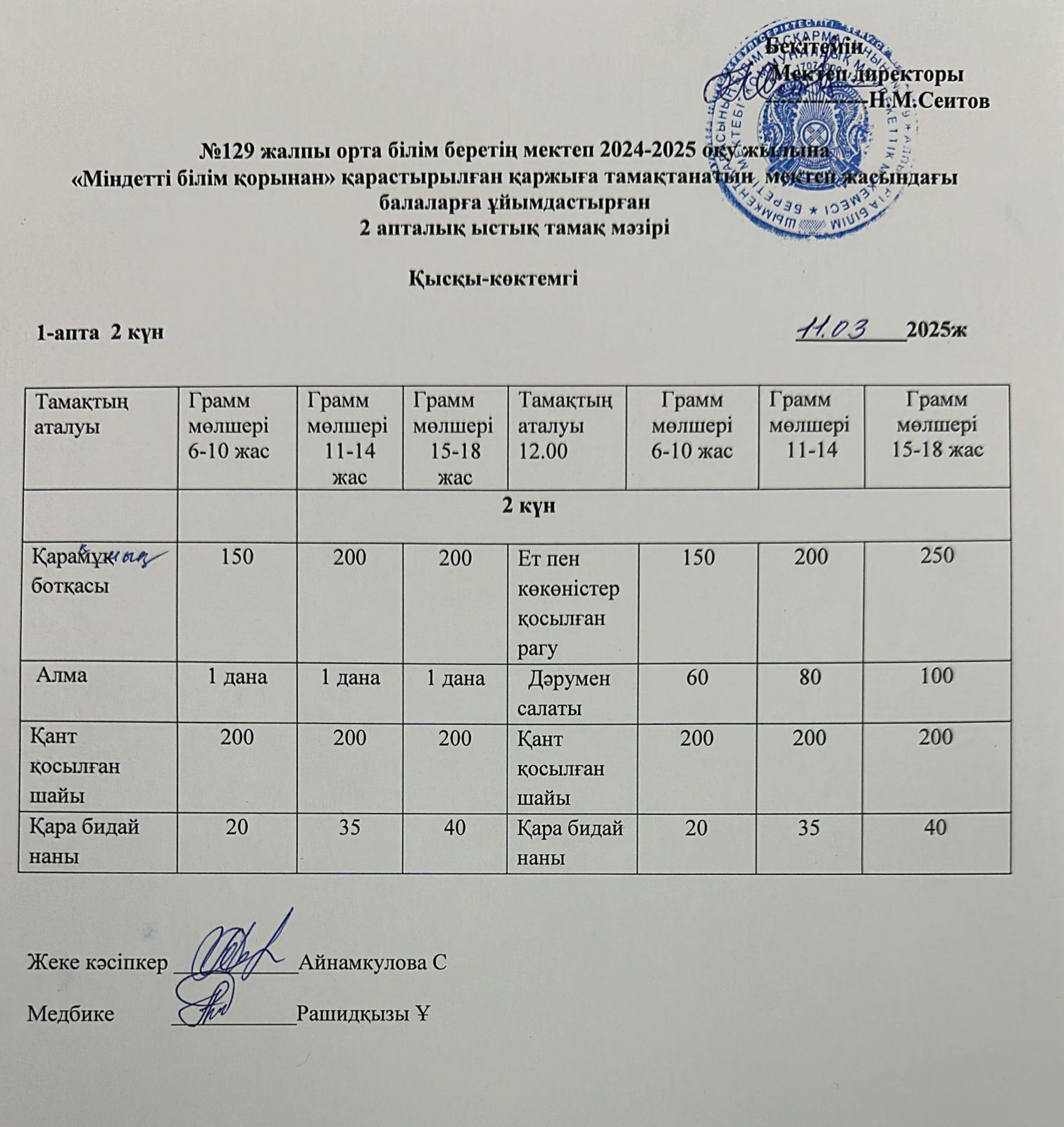 11.03.2025ж Бір күндік асхана мәзірі » №129 жалпы орта білім беретін мектеп